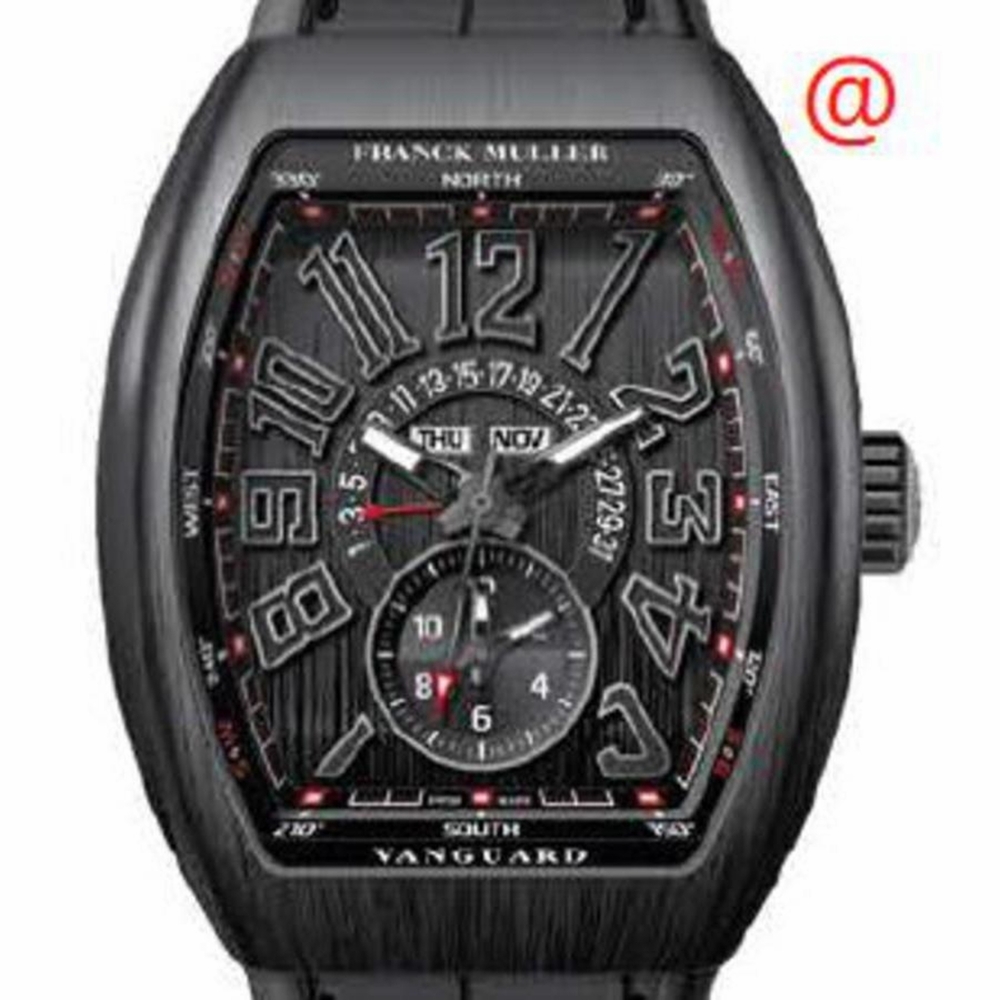 Black titanium case with a black leather strap. Fixed black titanium bezel. Black dial with black hands and Arabic numeral hour markers. Minute markers around the outer rim. Dial Type: Analog. Luminescent hands and markers. Automatic movement. Scratch resistant sapphire crystal. Tonneau case shape, case size: 45 mm. Functions: month, date, day, hour, minute, second. Additional Info: original box, international warranty card, manual (complete accessories). Vanguard Series. Luxury watch style. Watch label: Swiss Made. Franck Muller Vanguard Automatic Black Dial Mens Watch V45MCMBTTNRBRTT(NRNRTTBR).