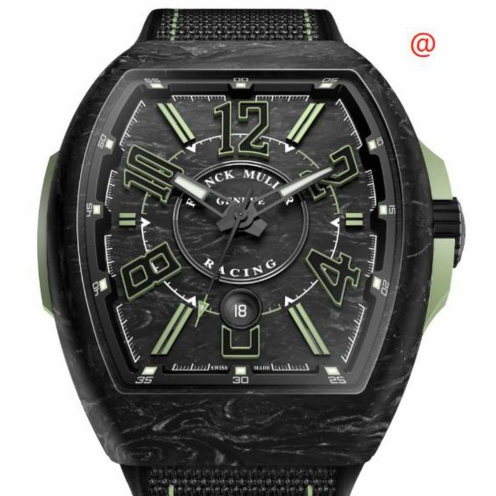 Black polycarbonate case with a black leather strap. Fixed black polycarbonate bezel. Black dial with black hands and Arabic numeral hour markers. Minute markers around the outer rim. Dial Type: Analog. Luminescent hands and markers. Date display at the 6 o'clock position. Automatic movement. Scratch resistant sapphire crystal. Screw down crown. Tonneau case shape, case size: 44 mm. Functions: date, hour, minute, second. Additional Info: original box, international warranty card, manual (complete accessories). Vanguard Series. Luxury watch style. Watch label: Swiss Made. Franck Muller Vanguard Automatic Black Dial Mens Watch V45RCGSCDTKRY2CARVECAR(VENR).