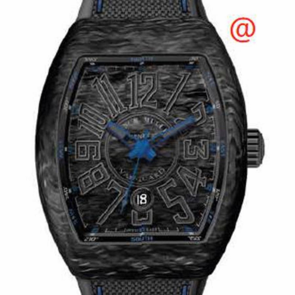 Black polycarbonate case with a black alligator band. Fixed black polycarbonate bezel. Black dial with black hands and Arabic numeral hour markers. Minute markers around the outer rim. Dial Type: Analog. Luminescent hands and markers. Date display at the 6 o'clock position. Automatic movement. Scratch resistant sapphire crystal. Tonneau case shape, case size: 45 mm. Functions: date, hour, minute, second. Additional Info: original box, international warranty card, manual (complete accessories). Vanguard Series. Luxury watch style. Watch label: Swiss Made. Franck Muller Vanguard Automatic Black Dial Mens Watch V45SCDTCARBONBL(CARNRNR).