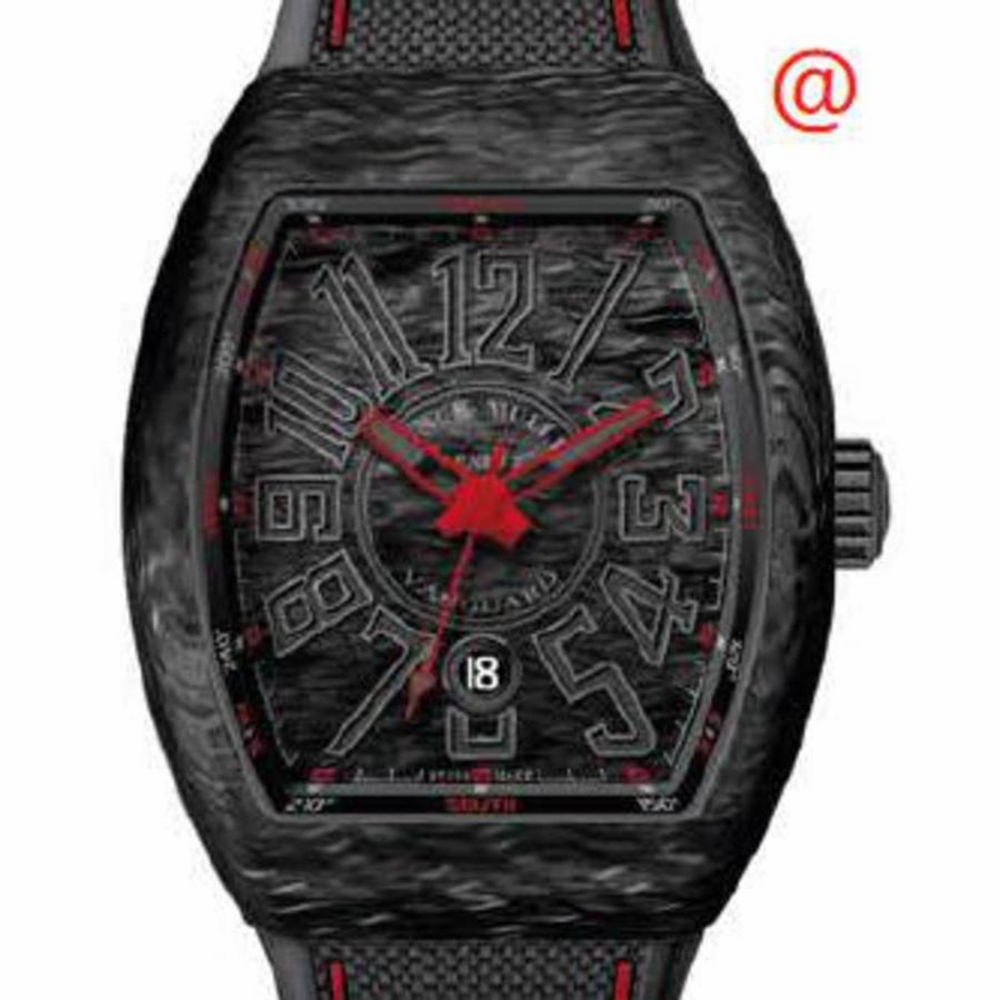 Black polycarbonate case with a black alligator band. Fixed black polycarbonate bezel. Black dial with red hands and Arabic numeral hour markers. Minute markers around the outer rim. Dial Type: Analog. Date display at the 6 o'clock position. Automatic movement. Scratch resistant sapphire crystal. Tonneau case shape, case size: 45 mm. Functions: date, hour, minute, second. Additional Info: original box, international warranty card, manual (complete accessories). Vanguard Series. Luxury watch style. Watch label: Swiss Made. Franck Muller Vanguard Automatic Black Dial Mens Watch V45SCDTCARBONER(CARNRNR).