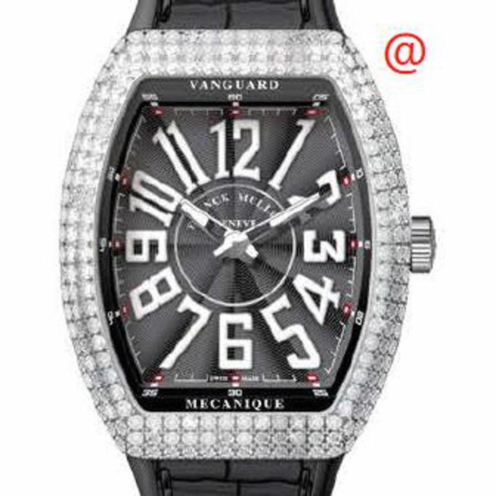 Silver-tone stainless steel case with a black alligator band. Fixed silver-tone bezel with diamond set stainless steel. Black dial with silver-tone hands and Arabic numeral hour markers. Minute markers around the outer rim. Dial Type: Analog. Luminescent hands and markers. Automatic movement. Scratch resistant sapphire crystal. Tonneau case shape, case size: 45 mm. Functions: hour, minute. Additional Info: original box, international warranty card, manual (complete accessories). Vanguard Series. Luxury watch style. Watch label: Swiss Made. Franck Muller Vanguard Automatic Diamond Black Dial Mens Watch V45SDACNR(NRBLCAC).
