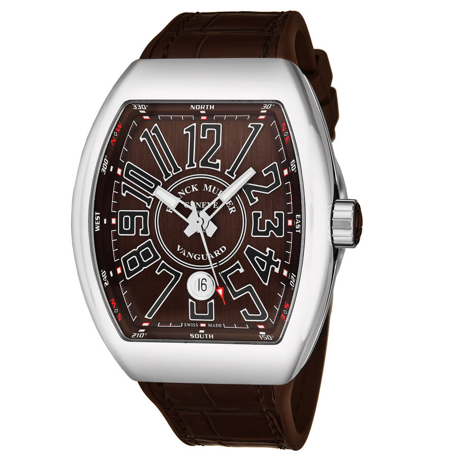 Silver-tone stainless steel case with a brown rubber strap. Fixed silver-tone stainless steel bezel. Brown dial with silver-tone hands and Arabic numeral hour markers. Minute markers around the outer rim. Dial Type: Analog. Luminescent hands and markers. Date display at the 6 o'clock position. Automatic movement. Scratch resistant sapphire crystal. Solid case back. Tonneau case shape, case size: 45 mm, case thickness: 13 mm. Band width: 25 mm, band length: 8 inches. Tang clasp. Water resistant at 30 meters / 100 feet. Functions: date, hour, minute, second. Vanguard Series. Luxury watch style. Watch label: Swiss Made. Franck Muller Vanguard Automatic Brown Dial Mens Watch 45SCSTLBRNSHNY.