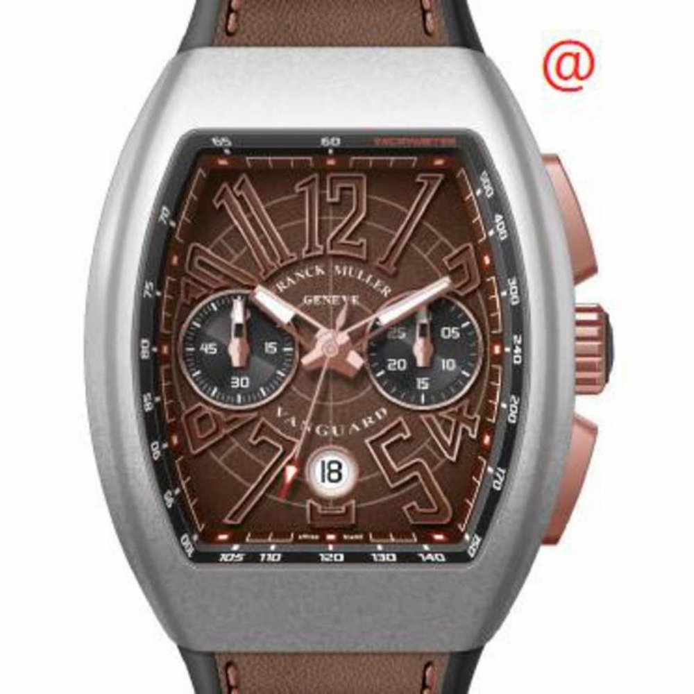 Silver-tone stainless steel case with a brown alligator band. Fixed silver-tone stainless steel bezel. Brown dial with rose gold-tone hands and Arabic numeral hour markers. Minute markers around the outer rim. Dial Type: Analog. Luminescent hands and markers. Date display at the 6 o'clock position. Chronograph - two sub-dials displaying: 60 second and 30 minute. Automatic movement. Scratch resistant sapphire crystal. Tonneau case shape, case size: 45 mm. Functions: chronograph, date, hour, minute, second. Additional Info: original box, international warranty card, manual (complete accessories). Vanguard Series. Luxury watch style. Watch label: Swiss Made. Franck Muller Vanguard Chronograph Automatic Brown Dial Mens Watch V45CCDTCIRBNACMC5NBR(BNBN5NBR).