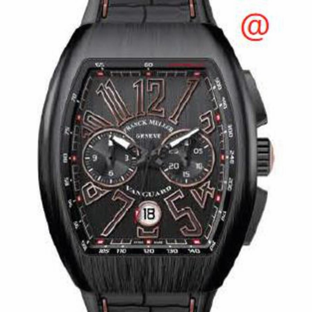 Black titanium case with a black alligator band. Fixed black titanium bezel. Black dial with black hands and Arabic numeral hour markers. Minute markers around the outer rim. Dial Type: Analog. Luminescent hands and markers. Date display at the 6 o'clock position. Automatic movement. Scratch resistant sapphire crystal. Tonneau case shape, case size: 41 mm. Functions: chronograph, date, hour, minute, second. Additional Info: original box, international warranty card, manual (complete accessories). Vanguard Classical Series. Luxury watch style. Watch label: Swiss Made. Franck Muller Vanguard Classical Chronograph Automatic Black Dial Mens Watch V41CCDTTTNRBR5N(NRNR5N).