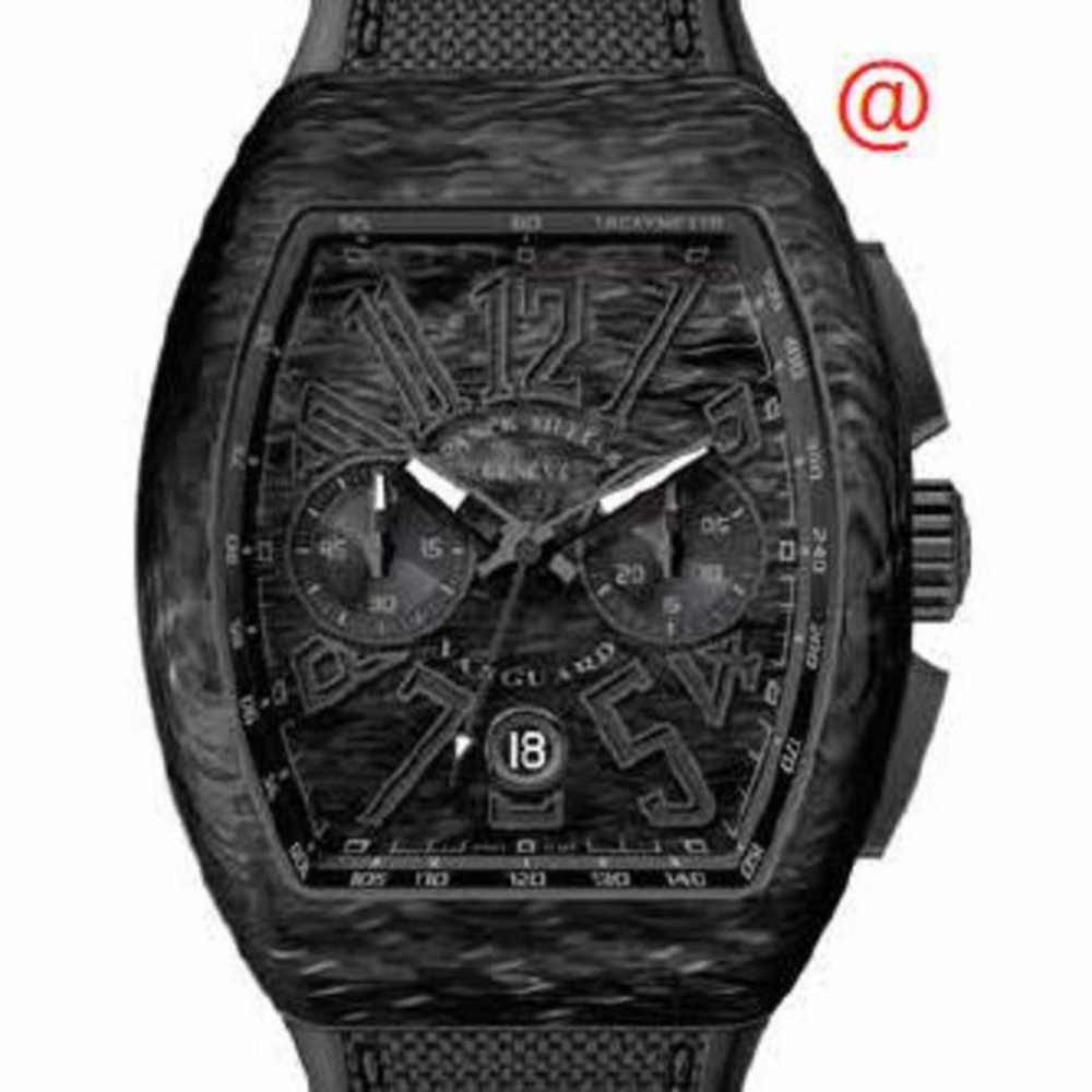 Black polycarbonate case with a black alligator band. Fixed black polycarbonate bezel. Black dial with black hands and Arabic numeral hour markers. Minute markers around the outer rim. Dial Type: Analog. Luminescent hands and markers. Date display at the 6 o'clock position. Chronograph - two sub-dials displaying: 60 second and 30 minute. Automatic movement. Scratch resistant sapphire crystal. Tonneau case shape, case size: 45 mm. Functions: chronograph, date, hour, minute, second. Additional Info: original box, international warranty card, manual (complete accessories). Vanguard Series. Luxury watch style. Watch label: Swiss Made. Franck Muller Vanguard Chronograph Automatic Black Dial Mens Watch V45CCDTCARBONNR(CARNRNR).