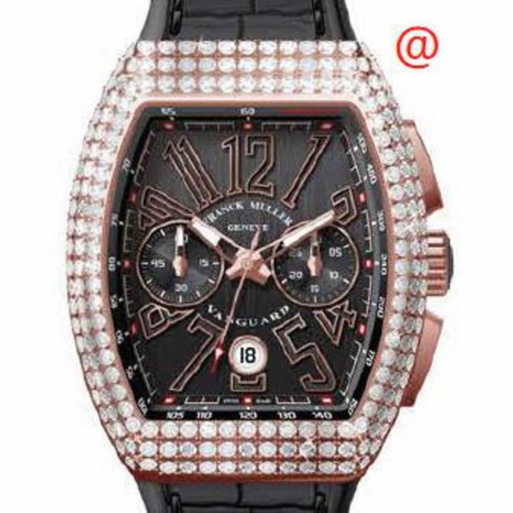 Rose gold-tone 18kt rose gold case with a black alligator band. Fixed rose gold-tone bezel with diamond set 18kt rose gold. Black dial with rose gold-tone hands and Arabic numeral hour markers. Minute markers around the outer rim. Dial Type: Analog. Luminescent hands and markers. Date display at the 6 o'clock position. Chronograph - two sub-dials displaying: 60 second and 30 minute. Automatic movement. Scratch resistant sapphire crystal. Tonneau case shape, case size: 45 mm. Functions: chronograph, date, hour, minute, second. Additional Info: original box, international warranty card, manual (complete accessories). Vanguard Series. Luxury watch style. Watch label: Swiss Made. Franck Muller Vanguard Chronograph Automatic Diamond Black Dial Mens Watch V45CCDTD5NNR(NRNR5N).