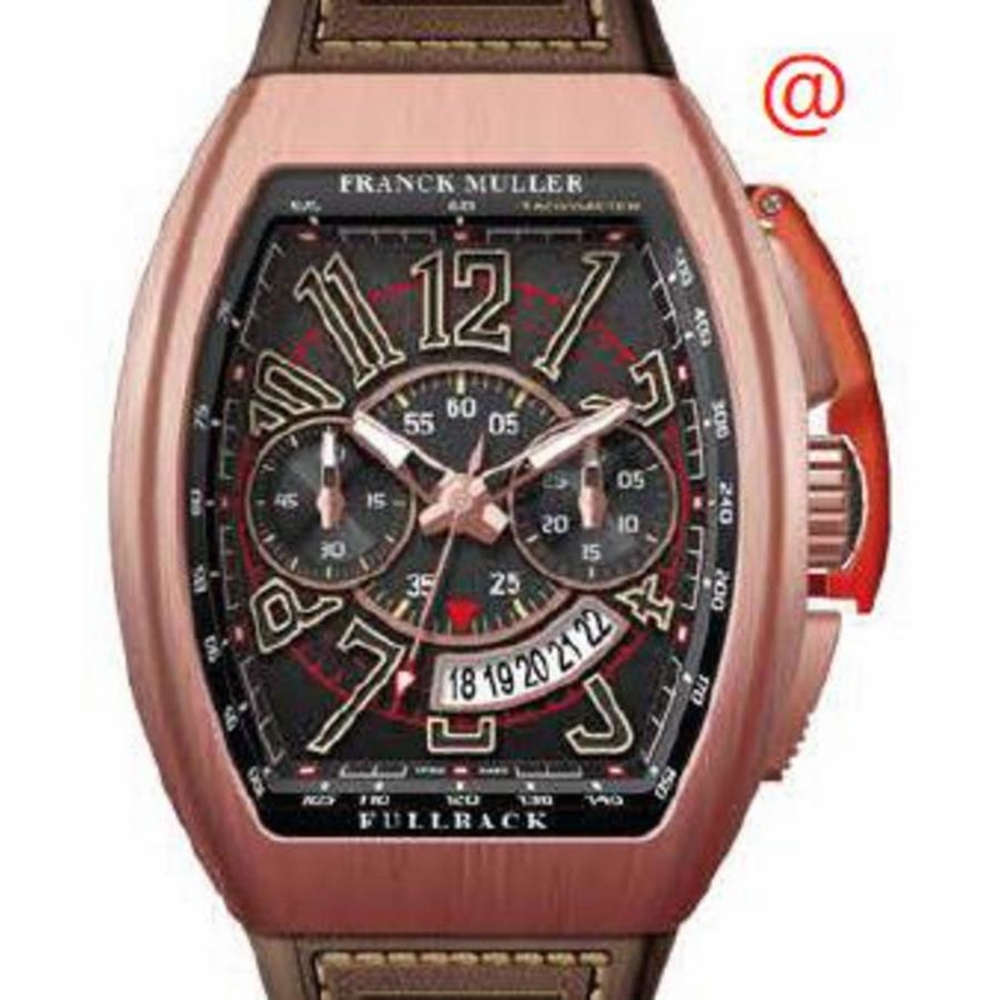 Rose gold-tone 18kt rose gold case with a brown alligator band. Fixed rose gold-tone 18kt rose gold bezel. Black dial with rose gold-tone hands and Arabic numeral hour markers. Minute markers around the outer rim. Dial Type: Analog. Luminescent hands and markers. Date display at the 6 o'clock position. Chronograph - three sub-dials displaying: 60 second, 30 minute and 12 hour. Automatic movement. Scratch resistant sapphire crystal. Tonneau case shape, case size: 45 mm. Functions: chronograph, date, hour, minute, second. Additional Info: original box, international warranty card, manual (complete accessories). Vanguard Series. Luxury watch style. Watch label: Swiss Made. Franck Muller Vanguard Chronograph Automatic Black Dial Mens Watch V45CCDTLCK5NBRBN(NRNRSB).