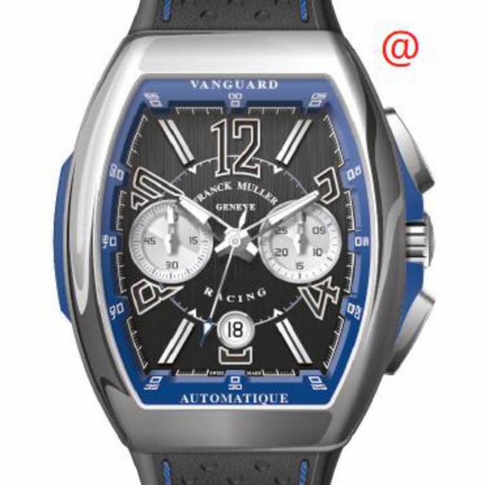 Silver-tone stainless steel case with a black alligator band. Fixed silver-tone stainless steel bezel. Black dial with silver-tone hands and Arabic numeral hour markers. Minute markers around the outer rim. Dial Type: Analog. Luminescent hands and markers. Date display at the 6 o'clock position. Chronograph - two sub-dials displaying: 60 second and 30 minute. Automatic movement. Scratch resistant sapphire crystal. Tonneau case shape, case size: 45 mm. Functions: chronograph, date, hour, minute, second. Additional Info: original box, international warranty card, manual (complete accessories). Vanguard Series. Luxury watch style. Watch label: Swiss Made. Franck Muller Vanguard Chronograph Automatic Black Dial Mens Watch V45CCDTRCGACBL(NRNRBLC).