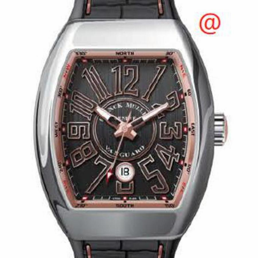Silver-tone stainless steel case with a black alligator band. Fixed silver-tone stainless steel bezel. Black dial with rose gold-tone hands and Arabic numeral hour markers. Minute markers around the outer rim. Dial Type: Analog. Luminescent hands and markers. Date display at the 6 o'clock position. Automatic movement. Scratch resistant sapphire crystal. Tonneau case shape, case size: 45 mm. Functions: date, hour, minute, second. Additional Info: original box, international warranty card, manual (complete accessories). Vanguard Series. Luxury watch style. Watch label: Swiss Made. Franck Muller Vanguard Automatic Black Dial Mens Watch V45SCDTAC5N(NRNR5N).
