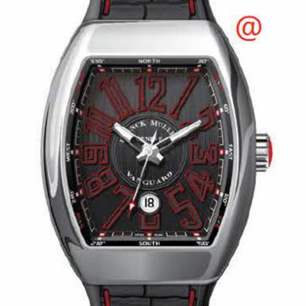 Silver-tone stainless steel case with a black alligator band. Fixed silver-tone stainless steel bezel. Black dial with silver-tone hands and Arabic numeral hour markers. Minute markers around the outer rim. Dial Type: Analog. Luminescent hands and markers. Date display at the 6 o'clock position. Automatic movement. Scratch resistant sapphire crystal. Tonneau case shape, case size: 45 mm. Functions: date, hour, minute, second. Additional Info: original box, international warranty card, manual (complete accessories). Vanguard Series. Luxury watch style. Watch label: Swiss Made. Franck Muller Vanguard Automatic Black Dial Mens Watch V45SCDTACER(NRNRRGE).