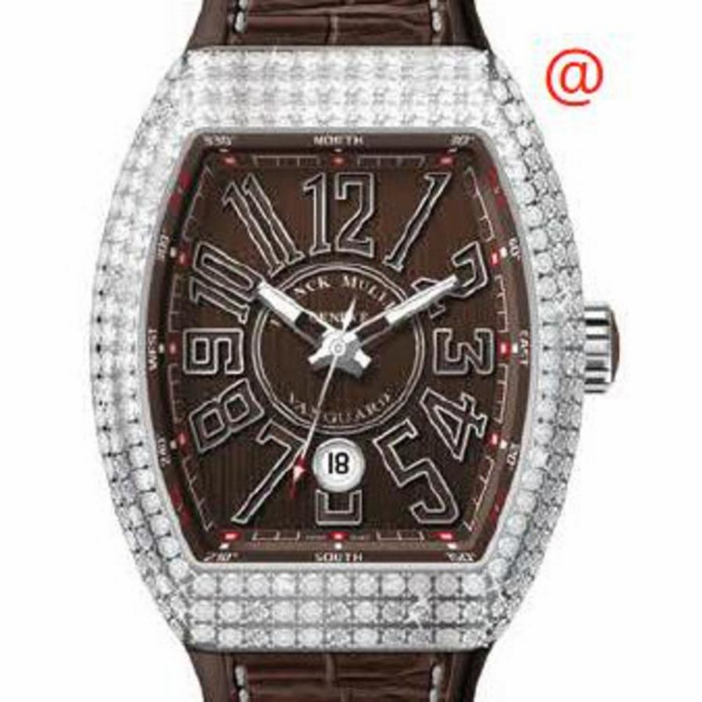 Silver-tone stainless steel case with a brown alligator band. Fixed silver-tone bezel with diamond set stainless steel. Brown dial with silver-tone hands and Arabic numeral hour markers. Minute markers around the outer rim. Dial Type: Analog. Luminescent hands and markers. Date display at the 6 o'clock position. Automatic movement. Scratch resistant sapphire crystal. Tonneau case shape, case size: 45 mm. Functions: date, hour, minute, second. Additional Info: original box, international warranty card, manual (complete accessories). Vanguard Series. Luxury watch style. Watch label: Swiss Made. Franck Muller Vanguard Automatic Diamond Brown Dial Mens Watch V45SCDTDACBN(BNBNAC).
