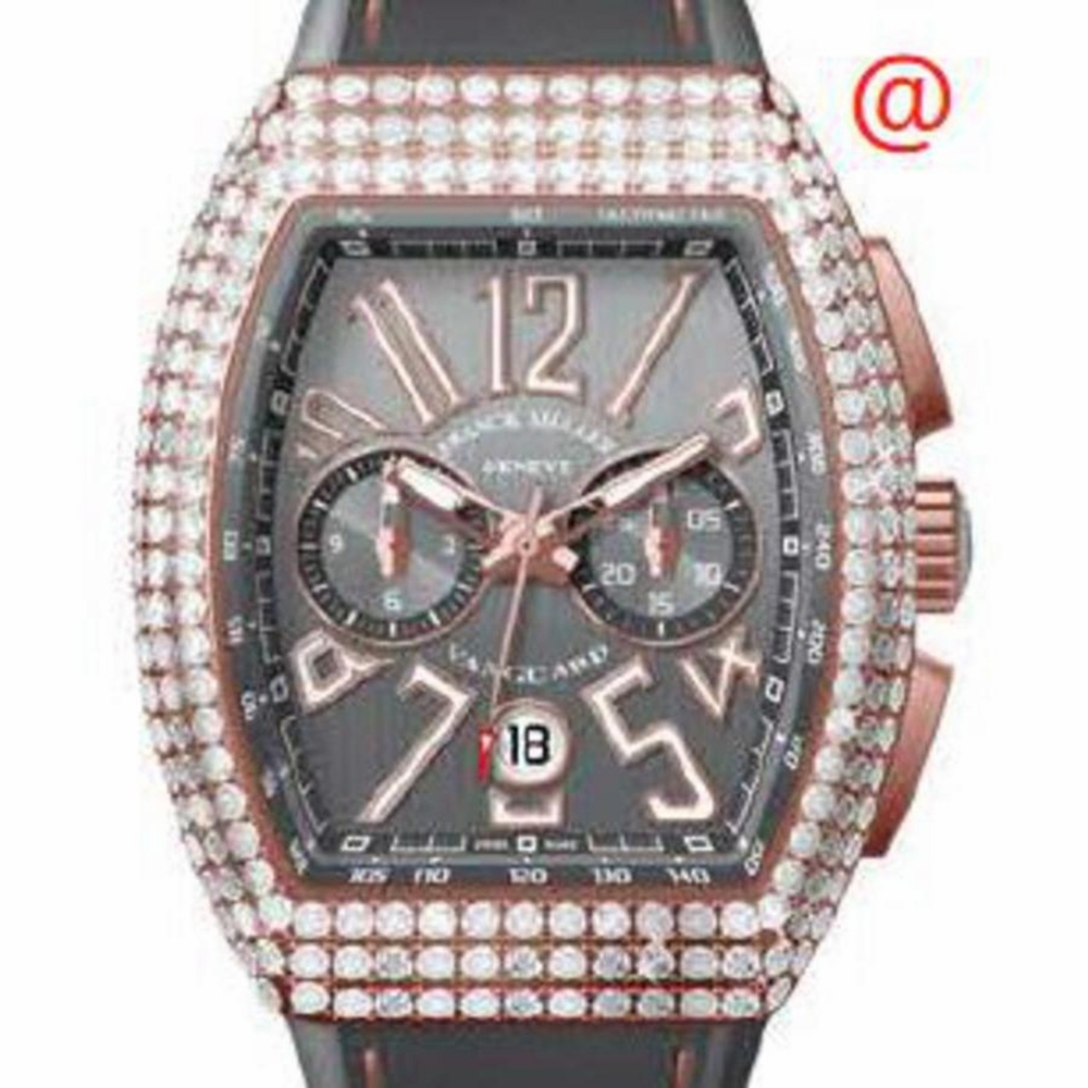 Rose gold-tone 18kt rose gold case with a grey rubber strap. Fixed rose gold-tone bezel with diamond set 18kt rose gold. Grey dial with rose gold-tone hands and Arabic numeral hour markers. Minute markers around the outer rim. Dial Type: Analog. Luminescent hands and markers. Date display at the 6 o'clock position. Automatic movement. Scratch resistant sapphire crystal. Tonneau case shape, case size: 41 mm. Functions: chronograph, date, hour, minute, second. Additional Info: original box, international warranty card, manual (complete accessories). Vanguard Classical Series. Luxury watch style. Watch label: Swiss Made. Franck Muller Vanguard Classical Chronograph Automatic Diamond Grey Dial Mens Watch V41CCDTD5NTT(TTBLC5N).