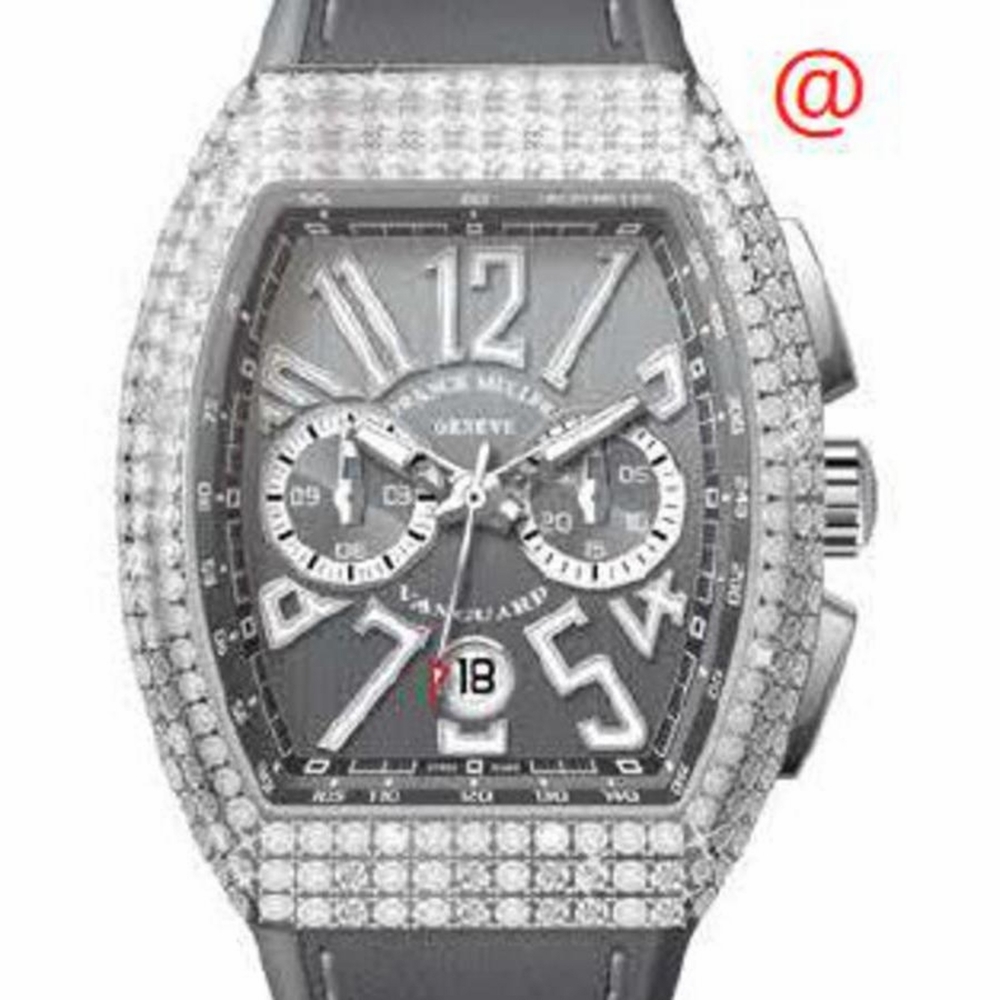 Silver-tone stainless steel case with a grey rubber strap. Fixed silver-tone bezel with diamond set stainless steel. Grey dial with silver-tone hands and Arabic numeral hour markers. Minute markers around the outer rim. Dial Type: Analog. Luminescent hands and markers. Date display at the 6 o'clock position. Automatic movement. Scratch resistant sapphire crystal. Tonneau case shape, case size: 41 mm. Functions: chronograph, date, hour, minute, second. Additional Info: original box, international warranty card, manual (complete accessories). Vanguard Classical Series. Luxury watch style. Watch label: Swiss Made. Franck Muller Vanguard Classical Chronograph Automatic Diamond Grey Dial Mens Watch V41CCDTDACTT(TTBLCAC).