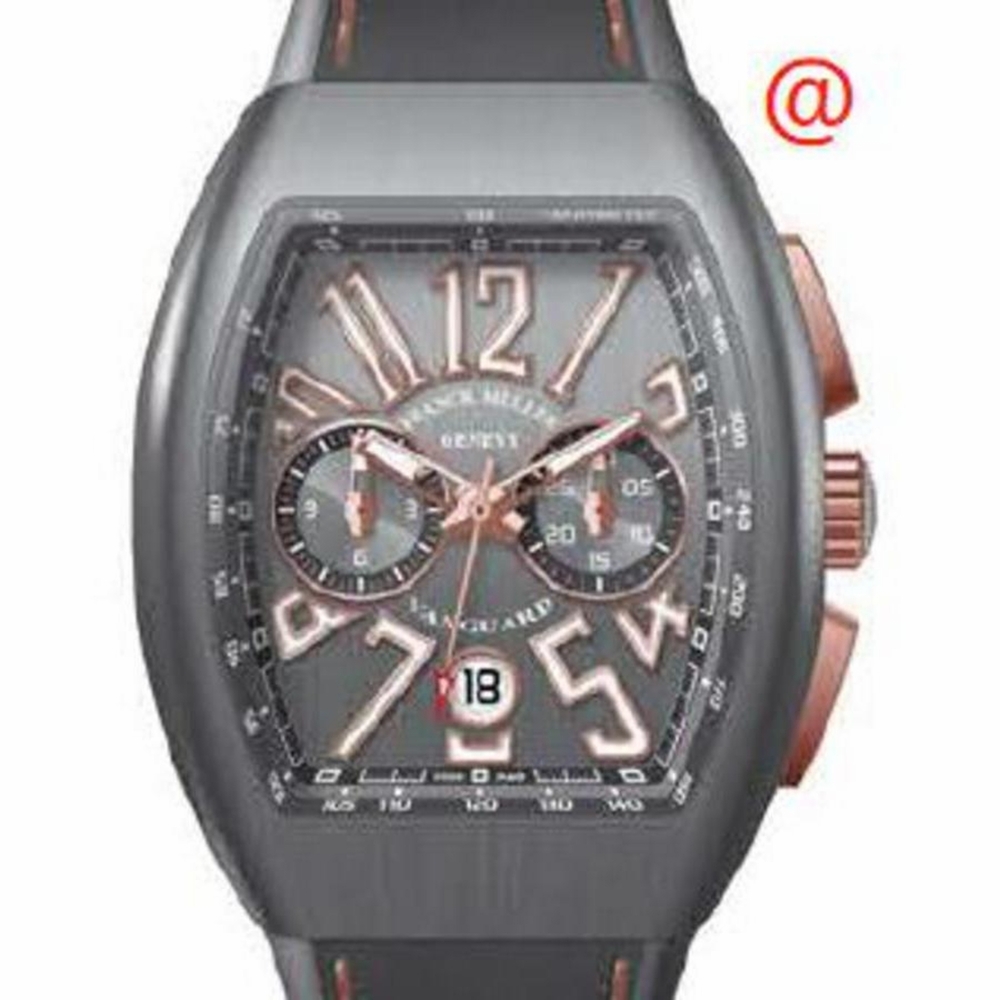 Grey titanium case with a grey rubber strap. Fixed grey titanium bezel. Grey dial with rose gold-tone hands and Arabic numeral hour markers. Minute markers around the outer rim. Dial Type: Analog. Luminescent hands and markers. Date display at the 6 o'clock position. Automatic movement. Scratch resistant sapphire crystal. Tonneau case shape, case size: 41 mm. Functions: chronograph, date, hour, minute, second. Additional Info: original box, international warranty card, manual (complete accessories). Vanguard Classical Series. Luxury watch style. Watch label: Swiss Made. Franck Muller Vanguard Classical Chronograph Automatic Grey Dial Mens Watch V41CCDTTTBRSTG(TTBLC5N).