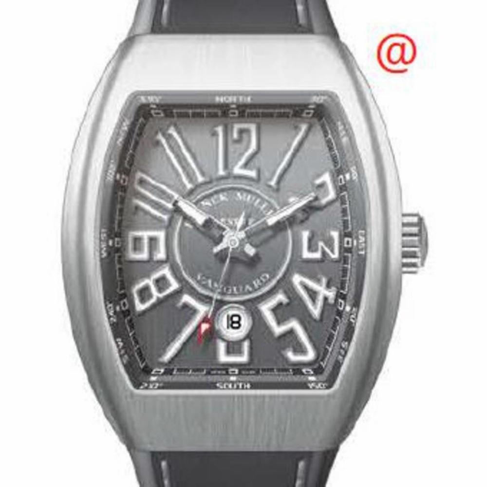 Silver-tone stainless steel case with a grey leather strap. Fixed silver-tone stainless steel bezel. Grey dial with silver-tone hands and Arabic numeral hour markers. Minute markers around the outer rim. Dial Type: Analog. Luminescent hands and markers. Date display at the 6 o'clock position. Automatic movement. Scratch resistant sapphire crystal. Tonneau case shape, case size: 45 mm. Functions: date, hour, minute, second. Additional Info: original box, international warranty card, manual (complete accessories). Vanguard Classical Series. Luxury watch style. Watch label: Swiss Made. Franck Muller Vanguard Classical Automatic Grey Dial Mens Watch V45SCDTACBRTT(TTBLCACBR).