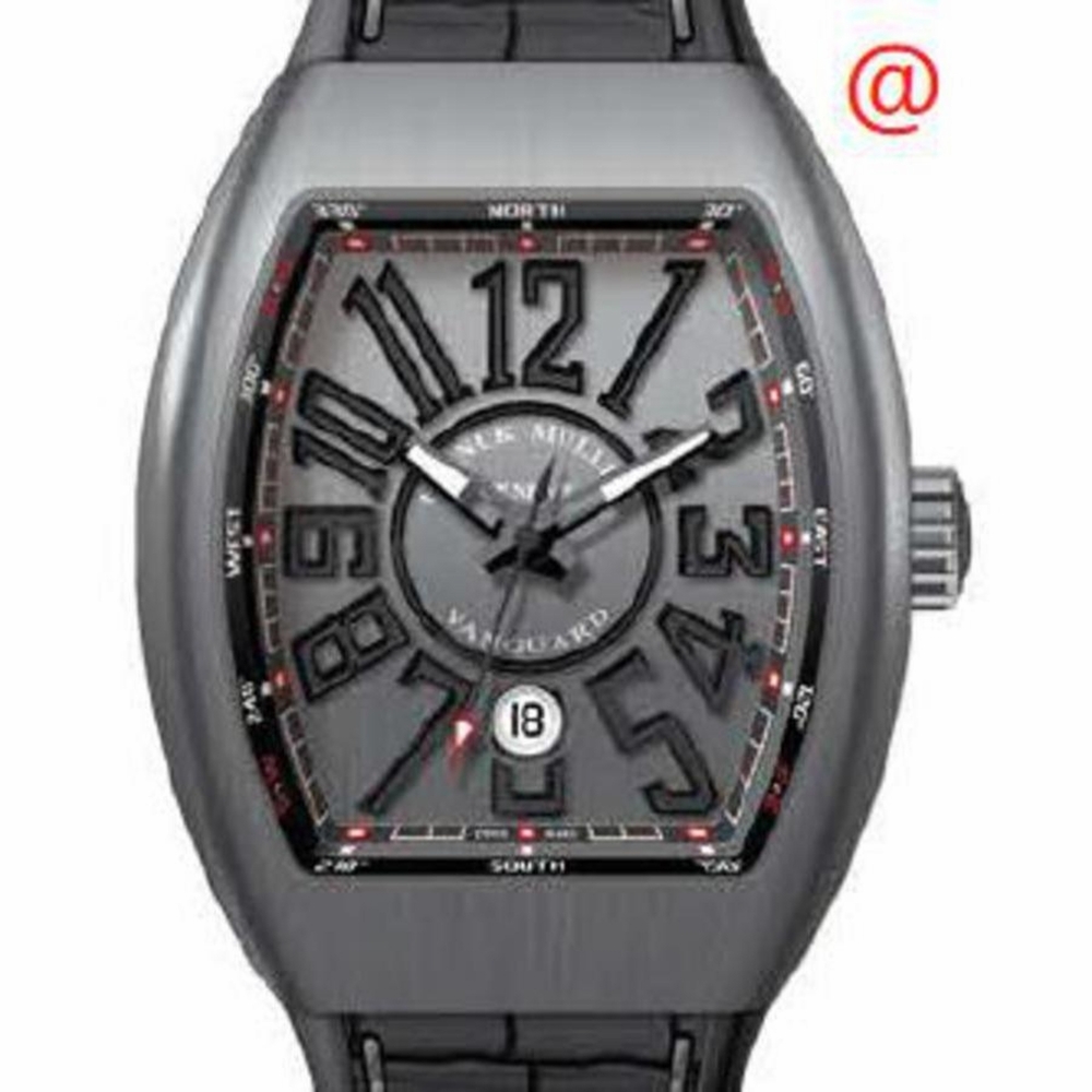 Black titanium case with a black alligator band. Fixed black titanium bezel. Grey dial with black hands and Arabic numeral hour markers. Minute markers around the outer rim. Dial Type: Analog. Luminescent hands and markers. Date display at the 6 o'clock position. Automatic movement. Scratch resistant sapphire crystal. Tonneau case shape, case size: 45 mm. Functions: date, hour, minute, second. Additional Info: original box, international warranty card, manual (complete accessories). Vanguard Series. Luxury watch style. Watch label: Swiss Made. Franck Muller Vanguard Automatic Grey Dial Mens Watch V45SCDTTTBRNR(TTNRNR).