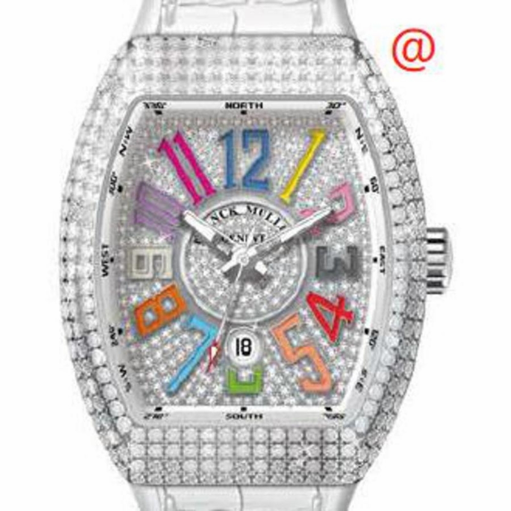 Silver-tone stainless steel case with a white alligator band. Fixed silver-tone bezel with diamond set stainless steel. Silver-tone dial with silver-tone hands and Arabic numeral hour markers. Dial Type: Analog. Luminescent hands and markers. Date display at the 6 o'clock position. Automatic movement. Scratch resistant sapphire crystal. Tonneau case shape, case size: 45 mm. Functions: date, hour, minute, second. Additional Info: original box, international warranty card, manual (complete accessories). Vanguard Classical Series. Luxury watch style. Watch label: Swiss Made. Franck Muller Vanguard Classical Automatic Diamond Silver Dial Mens Watch V45SCDTCOLDRMDCDACBC(DIAMCOLAC).