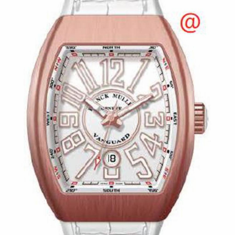 Rose gold-tone 18kt rose gold case with a white alligator band. Fixed rose gold-tone 18kt rose gold bezel. White dial with rose gold-tone hands and Arabic numeral hour markers. Minute markers around the outer rim. Dial Type: Analog. Luminescent hands and markers. Date display at the 6 o'clock position. Automatic movement. Scratch resistant sapphire crystal. Tonneau case shape, case size: 45 mm. Functions: date, hour, minute, second. Additional Info: original box, international warranty card, manual (complete accessories). Vanguard Classical Series. Luxury watch style. Watch label: Swiss Made. Franck Muller Vanguard Classical Automatic White Dial Mens Watch V45SCDT5NBRBC(BLCBLC5NBR).