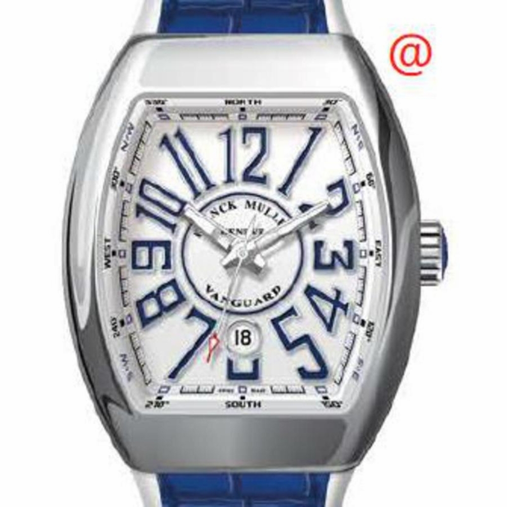 Silver-tone stainless steel case with a blue leather strap. Fixed silver-tone stainless steel bezel. White dial with silver-tone hands and Arabic numeral hour markers. Minute markers around the outer rim. Dial Type: Analog. Luminescent hands and markers. Date display at the 6 o'clock position. Automatic movement. Scratch resistant sapphire crystal. Tonneau case shape, case size: 45 mm. Functions: date, hour, minute, second. Additional Info: original box, international warranty card, manual (complete accessories). Vanguard Series. Luxury watch style. Watch label: Swiss Made. Franck Muller Vanguard Automatic White Dial Mens Watch V45SCDTACBU(BLCBLAC).