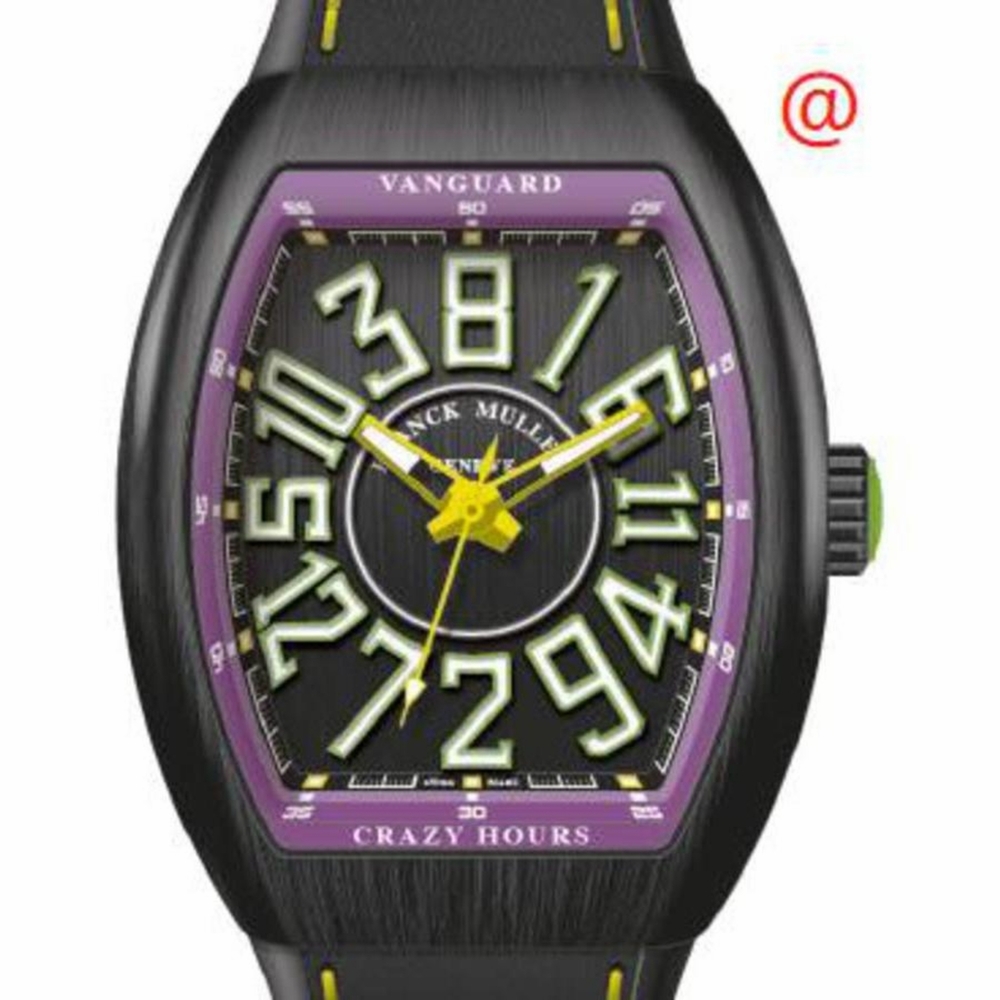 Black titanium case with a black alligator band. Fixed black titanium bezel. Black dial with yellow hands and Arabic numeral hour markers. Minute markers around the outer rim. Dial Type: Analog. Luminescent hands and markers. Automatic movement. Scratch resistant sapphire crystal. Tonneau case shape, case size: 45 mm. Functions: hour, minute, second. Additional Info: original box, international warranty card, manual (complete accessories). Vanguard Crazy Hours Series. Luxury watch style. Watch label: Swiss Made. Franck Muller Vanguard Crazy Hours Automatic Black Dial Mens Watch V45CHTTNRBRVL(NRBLCVE).