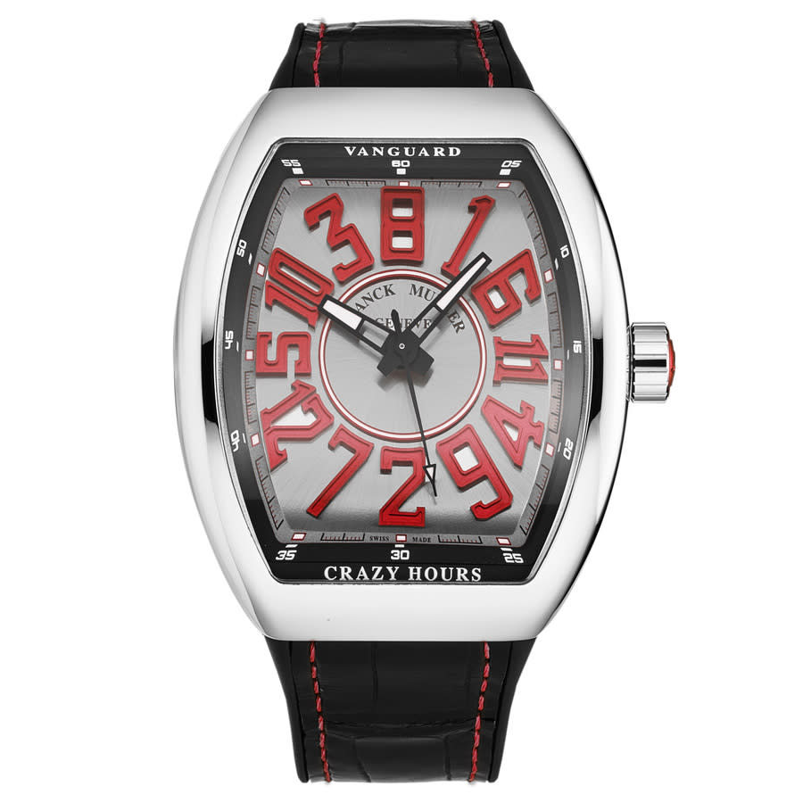 Silver-tone stainless steel case with a black rubber strap. Fixed silver-tone stainless steel bezel. Silver-tone dial with black hands and Arabic numeral hour markers. Minute markers around the outer rim. Dial Type: Analog. Luminescent hands and markers. Automatic movement. Scratch resistant sapphire crystal. Screw down crown. Solid case back. Tonneau case shape, case size: 45 mm, case thickness: 14 mm. Band width: 27 mm, band length: 8 inches. Deployment with push button release clasp. Water resistant at 30 meters / 100 feet. Functions: hour, minute, second. Vanguard Crazy Hours Series. Luxury watch style. Watch label: Swiss Made. Franck Muller Vanguard Crazy Hours Automatic Silver Dial Mens Watch 45CHACERSILRED.