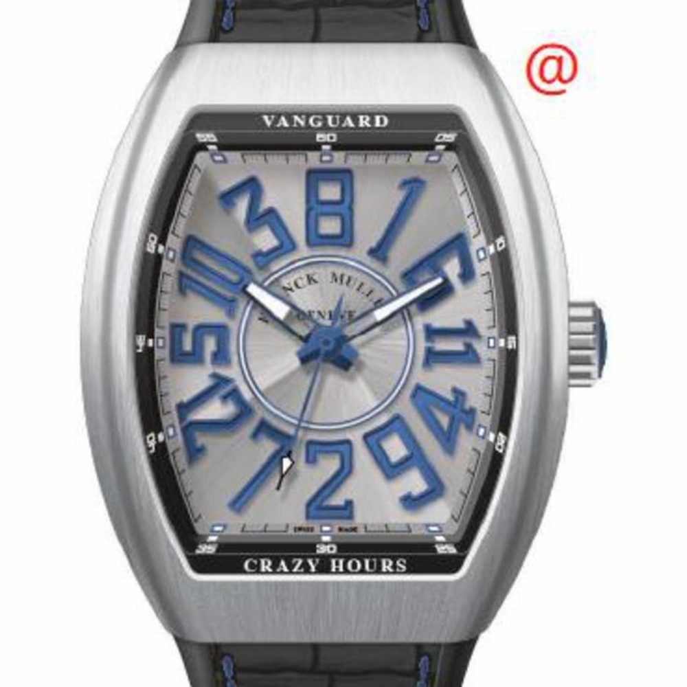 Silver-tone stainless steel case with a black alligator band. Fixed silver-tone stainless steel bezel. Silver-tone dial with blue hands and Arabic numeral hour markers. Minute markers around the outer rim. Dial Type: Analog. Luminescent hands. Automatic movement. Scratch resistant sapphire crystal. Tonneau case shape, case size: 45 mm. Functions: hour, minute, second. Additional Info: original box, international warranty card, manual (complete accessories). Vanguard Crazy Hours Series. Luxury watch style. Watch label: Swiss Made. Franck Muller Vanguard Crazy Hours Automatic Silver Dial Mens Watch V45CHACBRBL(ACBLBL).