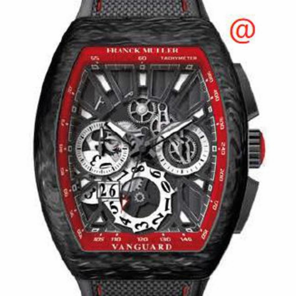 Black polycarbonate case with a black alligator band. Fixed black polycarbonate bezel. Black dial with black hands and index hour markers. Minute markers around the outer rim. Dial Type: Analog. Luminescent hands and markers. Date display at the 7 o'clock position. Automatic movement. Scratch resistant sapphire crystal. Tonneau case shape, case size: 45 mm. Functions: chronograph, date, hour, minute, second. Additional Info: original box, international warranty card, manual (complete accessories). Vanguard Grande Date Series. Luxury watch style. Watch label: Swiss Made. Franck Muller Vanguard Grande Date Chronograph Automatic Black Dial Mens Watch V45CCGDSQTCARBONNR(NRLUMNRRGE).