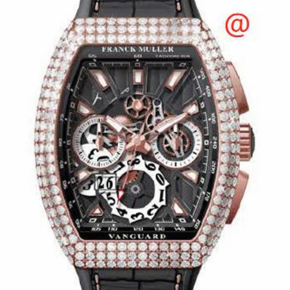 Rose gold-tone 18kt rose gold case with a black alligator band. Fixed rose gold-tone bezel with diamond set 18kt rose gold. Black dial with rose gold-tone hands and Arabic numeral hour markers. Dial Type: Analog. Luminescent hands and markers. Date display at the 8 o'clock position. Automatic movement. Scratch resistant sapphire crystal. Tonneau case shape, case size: 45 mm. Functions: chronograph, date, hour, minute, second. Additional Info: original box, international warranty card, manual (complete accessories). Vanguard Grande Date Series. Luxury watch style. Watch label: Swiss Made. Franck Muller Vanguard Grande Date Chronograph Automatic Diamond Black Dial Mens Watch V45CCGDSQTD5NNR(NRLUM5N).