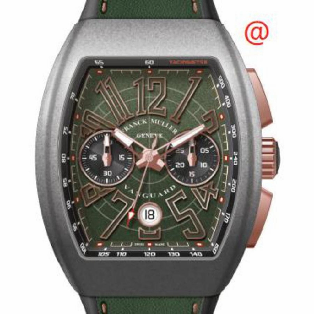 Grey titanium case with a green alligator band. Fixed grey titanium bezel. Green dial with rose gold-tone hands and Arabic numeral hour markers. Minute markers around the outer rim. Dial Type: Analog. Luminescent hands and markers. Date display at the 6 o'clock position. Chronograph - two sub-dials displaying: 60 second and 30 minute. Automatic movement. Scratch resistant sapphire crystal. Tonneau case shape, case size: 45 mm. Functions: chronograph, date, hour, minute, second. Additional Info: original box, international warranty card, manual (complete accessories). Vanguard Series. Luxury watch style. Watch label: Swiss Made. Franck Muller Vanguard Chronograph Automatic Green Dial Mens Watch V45CCDTCIRVRTTMC5NBR(VRVR5NBR).