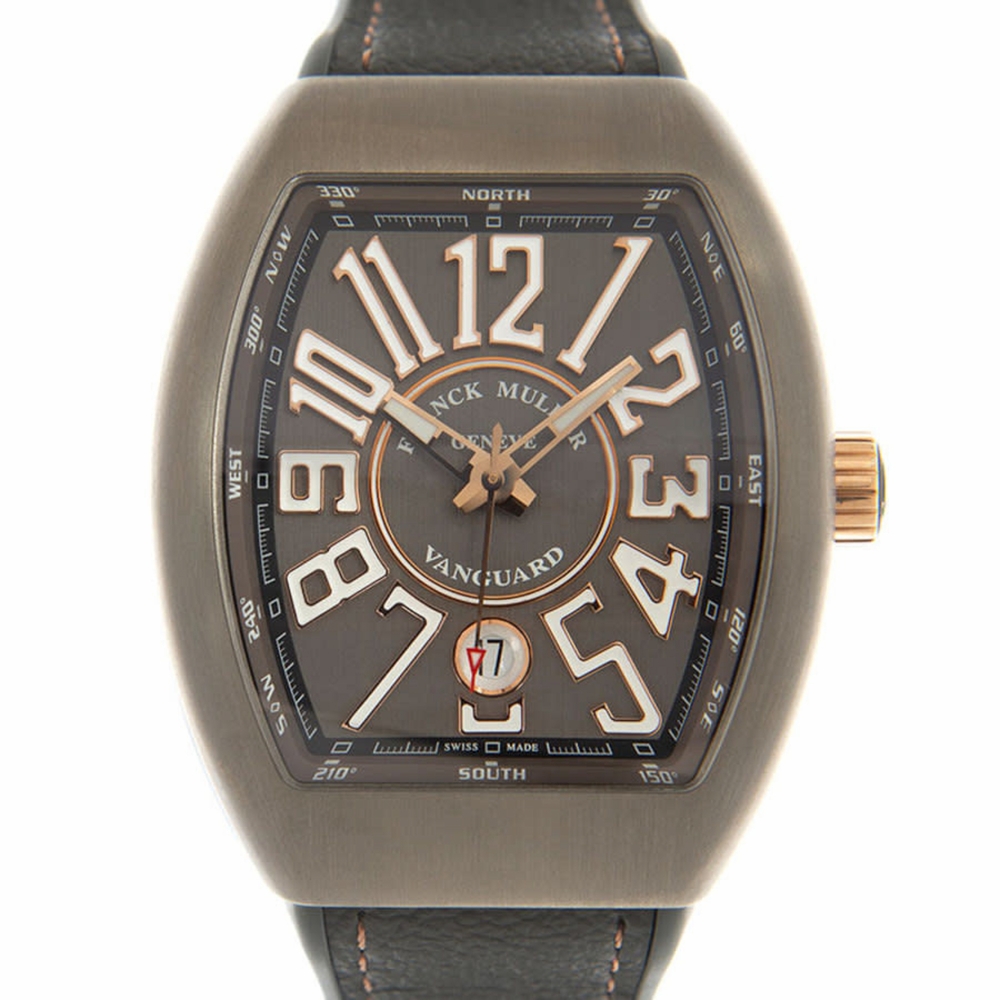 Black stainless steel case with a grey leather strap. Fixed black stainless steel bezel. Grey dial with gold-tone hands and Arabic numeral hour markers. Minute markers around the outer rim. Dial Type: Analog. Luminescent hands and markers. Date display at the 6 o'clock position. Automatic movement. Scratch resistant sapphire crystal. Tonneau case shape, case size: 41 mm. Functions: date, hour, minute, second. Additional Info: original box, manual (complete accessories). Vanguard Series. Luxury watch style. Watch label: Swiss Made. Franck Muller Vanguard Automatic Grey Dial Mens Watch V41SCDTTTBRSTG.
