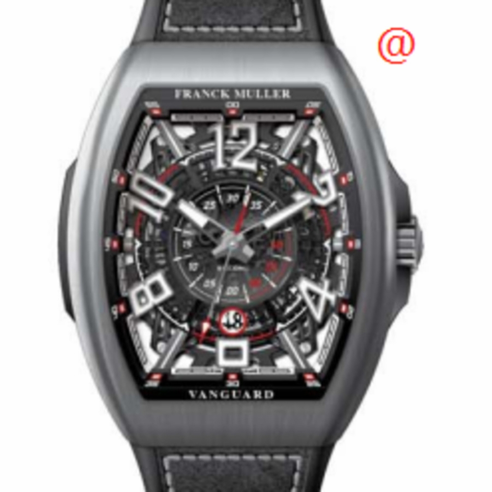 Black titanium case with a black leather strap. Fixed black titanium bezel. Black dial with black hands and Arabic numeral hour markers. Dial Type: Analog. Luminescent hands and markers. Date display at the 6 o'clock position. Automatic movement. Scratch resistant sapphire crystal. Transparent see through case back. Tonneau case shape, case size: 45 mm. Functions: date, hour, minute, second. Additional Info: original box, international warranty card, manual (complete accessories). Vanguard Mariner Series. Luxury watch style. Watch label: Swiss Made. Franck Muller Vanguard Mariner Automatic Black Dial Mens Watch V45SCDTSQTRCGTTBRNR(NRBLCTT).