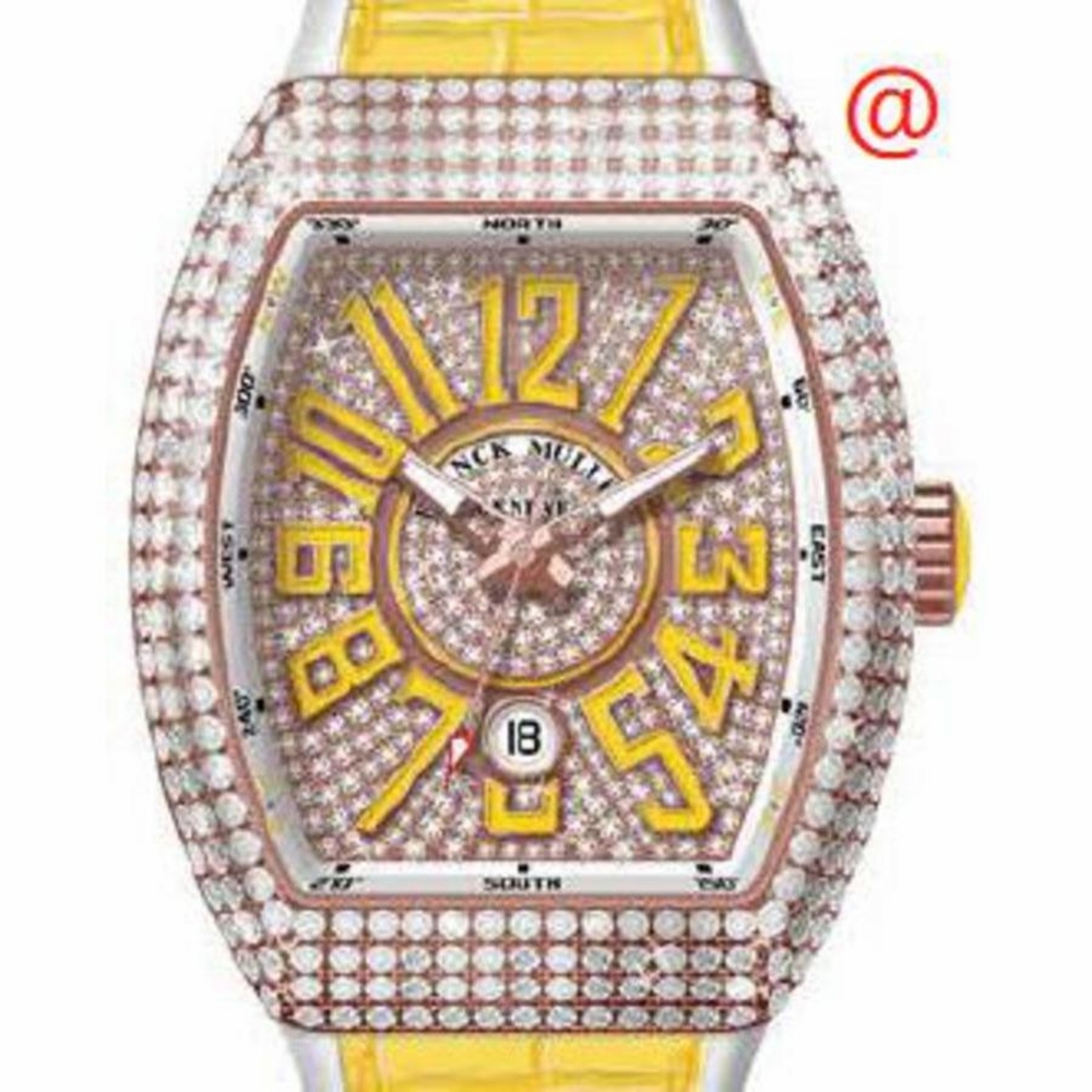 Rose gold-tone 18kt rose gold case with a yellow alligator band. Fixed rose gold-tone bezel with diamond set 18kt rose gold. Rose gold-tone dial with rose gold-tone hands and Arabic numeral hour markers. Dial Type: Analog. Luminescent hands and markers. Date display at the 6 o'clock position. Automatic movement. Scratch resistant sapphire crystal. Tonneau case shape, case size: 45 mm. Functions: date, hour, minute, second. Additional Info: original box, international warranty card, manual (complete accessories). Vanguard Classical Series. Luxury watch style. Watch label: Swiss Made. Franck Muller Vanguard Classical Automatic Diamond Rose Gold Dial Mens Watch V45SCDTDCD5NJA(DIAMJA5N).
