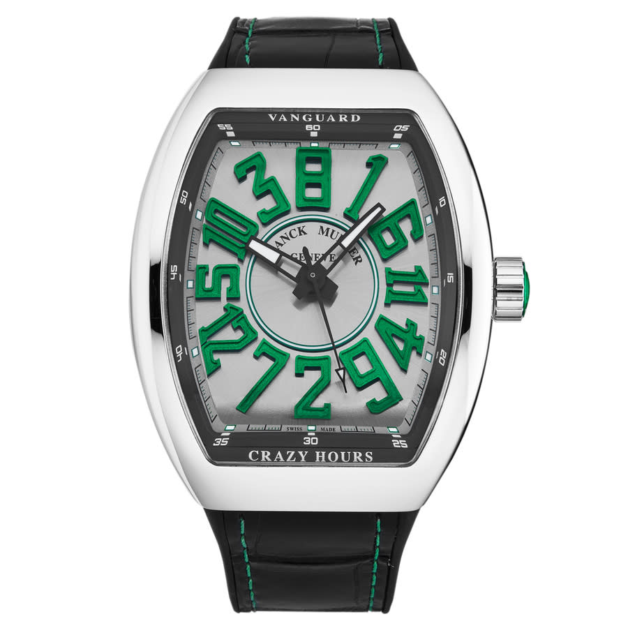 Stainless steel case with a black rubber strap. Fixed stainless steel bezel. Silver dial with black hands and Arabic numeral hour markers. Minute markers around the outer rim. Dial Type: Analog. Luminescent hands and markers. Automatic movement. Scratch resistant sapphire crystal. Screw down crown. Solid case back. Tonneau case shape. Case size: 45 mm. Case thickness: 14 mm. Band width: 27 mm. Band length: 8 inches. Deployment clasp with a push button release. Water resistant at 30 meters / 100 feet. Functions: hour, minute, second. Vanguard Crazy Hours Series. Luxury watch style. Watch label: Swiss Made. Franck Muller Vanguard Crazy Hours Automatic Silver Dial Mens Watch 45CHACBRGR.