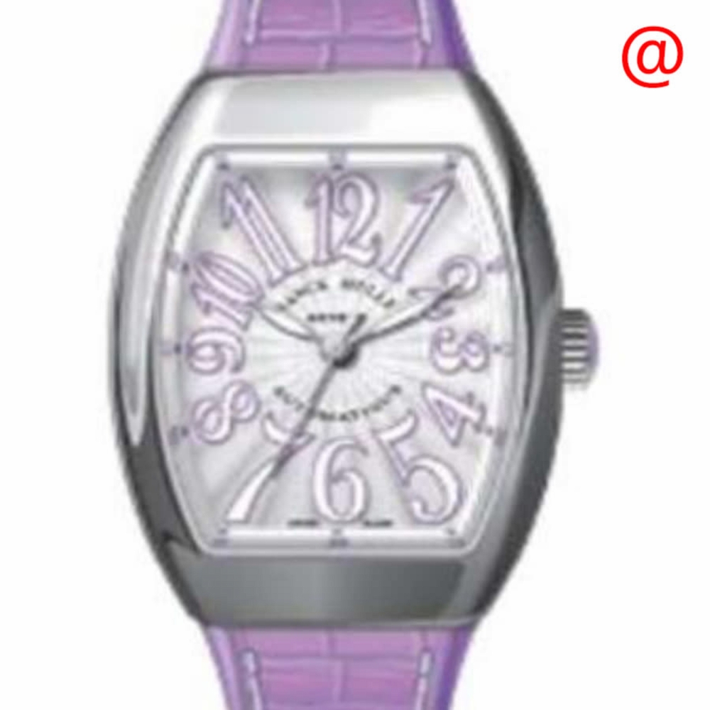 Silver-tone stainless steel case with a purple leather strap. Fixed silver-tone stainless steel bezel. Silver-tone dial with silver-tone hands and Arabic numeral hour markers. Dial Type: Analog. Quartz movement. Scratch resistant sapphire crystal. Tonneau case shape, case size: 32 mm. Functions: hour, minute, second. Additional Info: original box, international warranty card, manual (complete accessories). Vanguard Series. Luxury watch style. Watch label: Swiss Made. Franck Muller Vanguard Quartz Silver Dial Ladies Watch V32QZBLCVL(AC).
