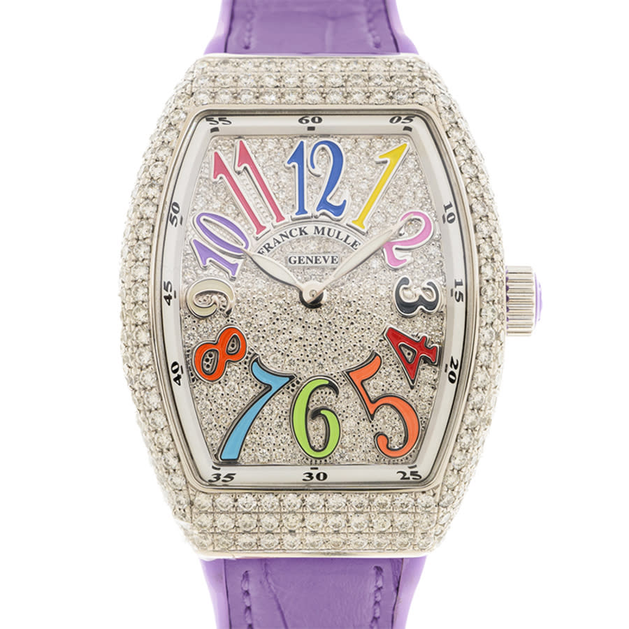 18kt white gold case with a purple alligator band. Fixed bezel with diamond set 18kt white gold. Silver-tone dial with silver-tone hands and Arabic numeral hour markers. Dial Type: Analog. Luminescent hands and markers. Quartz movement. Scratch resistant sapphire crystal. Screw down crown. Solid case back. Tonneau case shape, case size: 32 mm. Buckle clasp. Functions: hour, minute. Additional Info: original box, international warranty card, manual (complete accessories). Vanguard Series. Luxury watch style. Watch label: Swiss Made. Franck Muller Vanguard Quartz Diamond Silver Dial Ladies Watch V32QZDCDCOLDRM(ACVL).