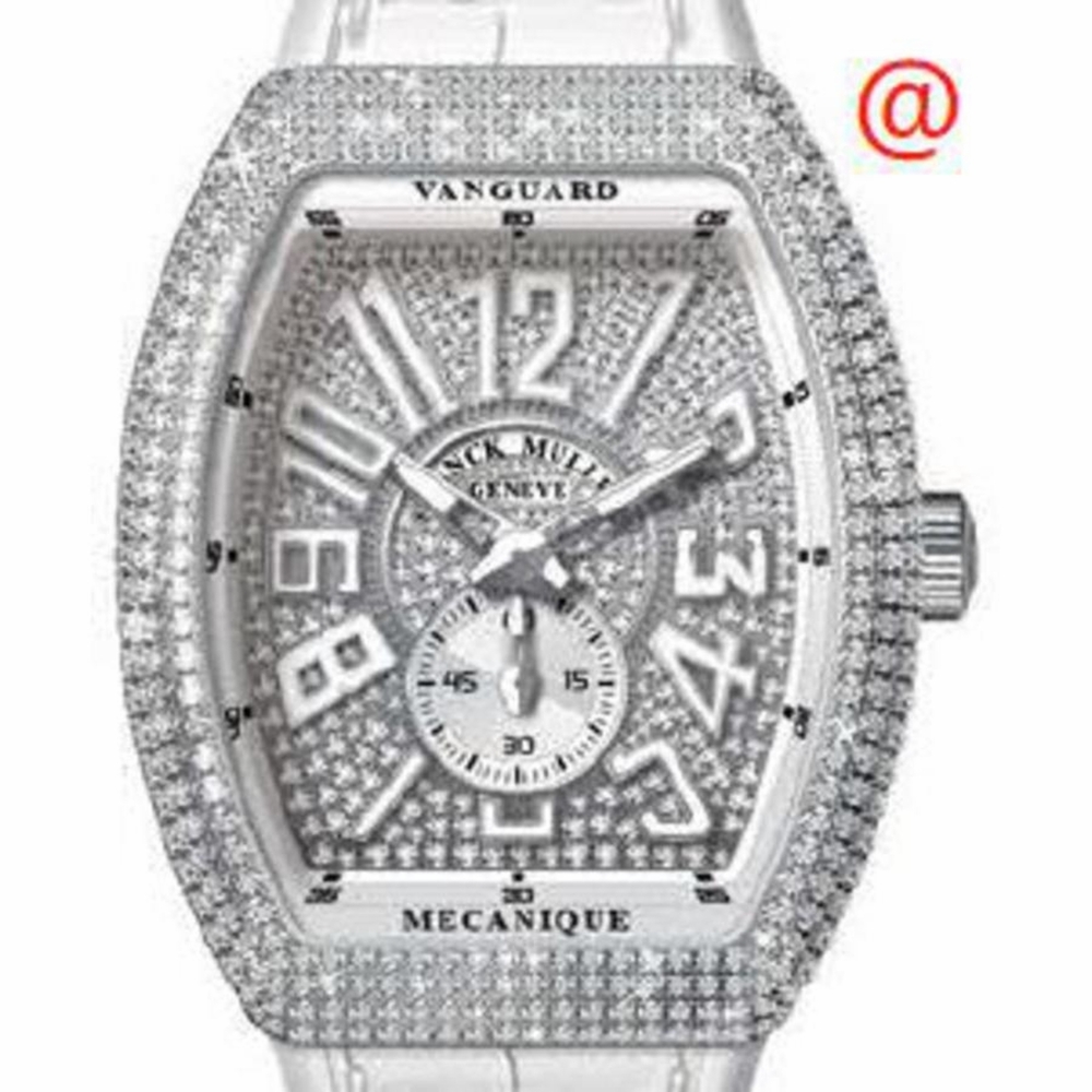 Silver-tone stainless steel case with a white alligator band. Fixed silver-tone bezel with diamond set stainless steel. Silver-tone dial with silver-tone hands and Arabic numeral hour markers. Dial Type: Analog. Luminescent hands and markers. Automatic movement. Scratch resistant sapphire crystal. Tonneau case shape, case size: 41 mm. Functions: hour, minute, second. Additional Info: original box, international warranty card, manual (complete accessories). Vanguard Series. Luxury watch style. Watch label: Swiss Made. Franck Muller Vanguard Automatic Diamond Silver Dial Mens Watch V41SS6DCDACBC(DIAMBLCAC).