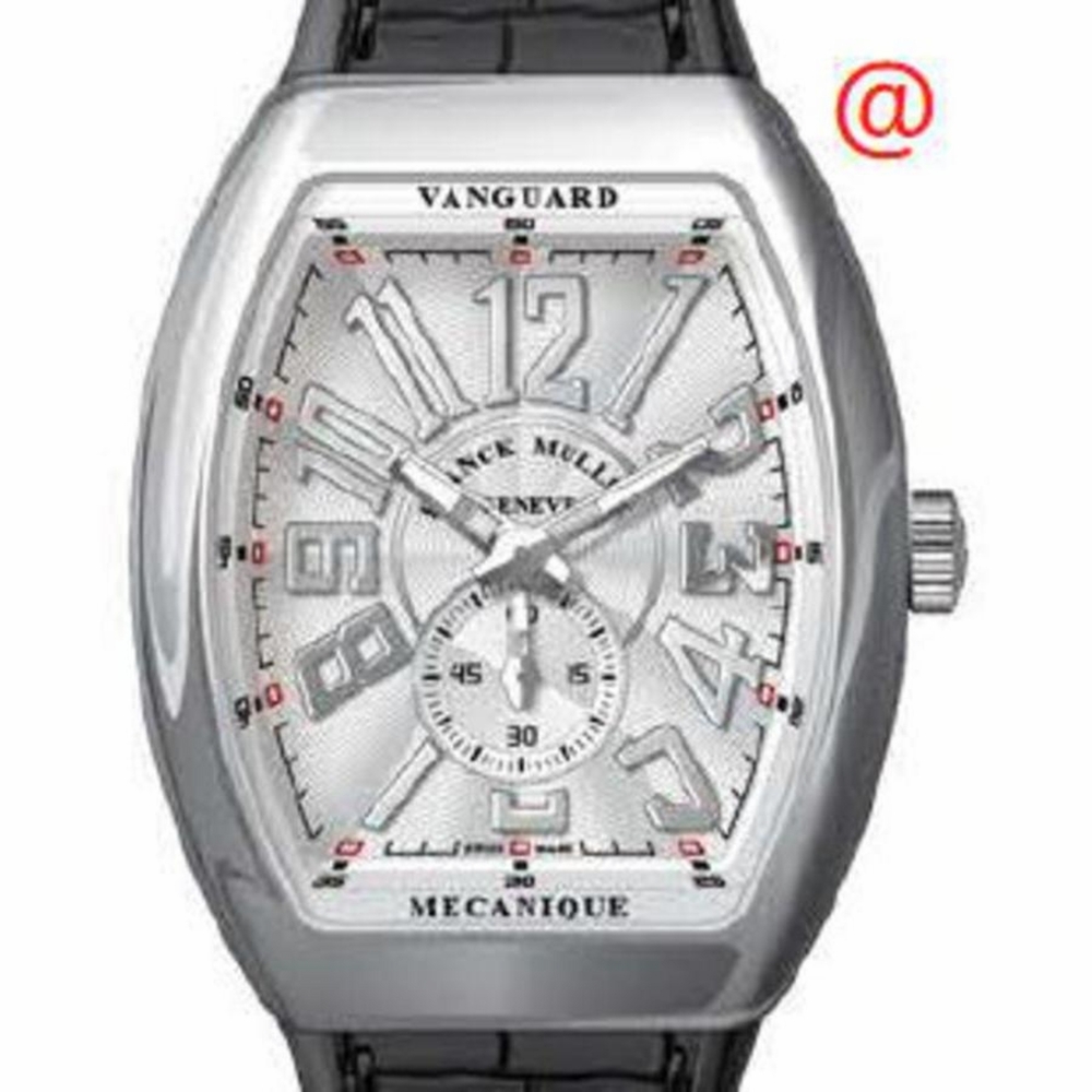 Silver-tone stainless steel case with a black alligator band. Fixed silver-tone stainless steel bezel. Silver-tone dial with silver-tone hands and Arabic numeral hour markers. Minute markers around the outer rim. Dial Type: Analog. Luminescent hands and markers. Automatic movement. Scratch resistant sapphire crystal. Tonneau case shape, case size: 41 mm. Functions: hour, minute, second. Additional Info: original box, international warranty card, manual (complete accessories). Vanguard Series. Luxury watch style. Watch label: Swiss Made. Franck Muller Vanguard Automatic Silver Dial Mens Watch V41SS6RELACNR(BLCAC).