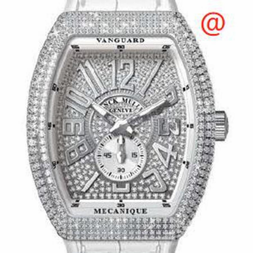 Silver-tone stainless steel case with a white alligator band. Fixed silver-tone bezel with diamond set stainless steel. Silver-tone dial with silver-tone hands and Arabic numeral hour markers. Dial Type: Analog. Luminescent hands and markers. Automatic movement. Scratch resistant sapphire crystal. Tonneau case shape, case size: 41 mm. Functions: hour, minute, second. Additional Info: original box, international warranty card, manual (complete accessories). Vanguard Series. Luxury watch style. Watch label: Swiss Made. Franck Muller Vanguard Automatic Diamond Silver Dial Mens Watch V41SS6RELDCDACBC(DIAMAC).