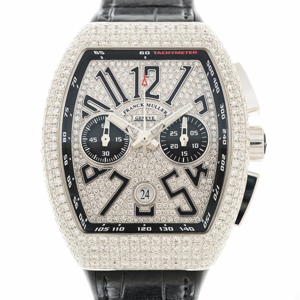 18kt white gold case with a black leather strap. Fixed bezel with diamond set 18kt white gold. Silver-tone dial with silver-tone hands and Arabic numeral hour markers. Dial Type: Analog. Luminescent hands and markers. Date display at the 6 o'clock position. Chronograph - two sub-dials displaying: 60 second and 30 minute. Automatic movement. Scratch resistant sapphire crystal. Tonneau case shape, case size: 44 mm. Functions: chronograph, date, hour, minute, second. Additional Info: original box, international warranty card, manual (complete accessories). Vanguard Series. Luxury watch style. Watch label: Swiss Made. Franck Muller Vanguard Chronograph Automatic Diamond Silver Dial Mens Watch V45CCDTDCD(OGNR).