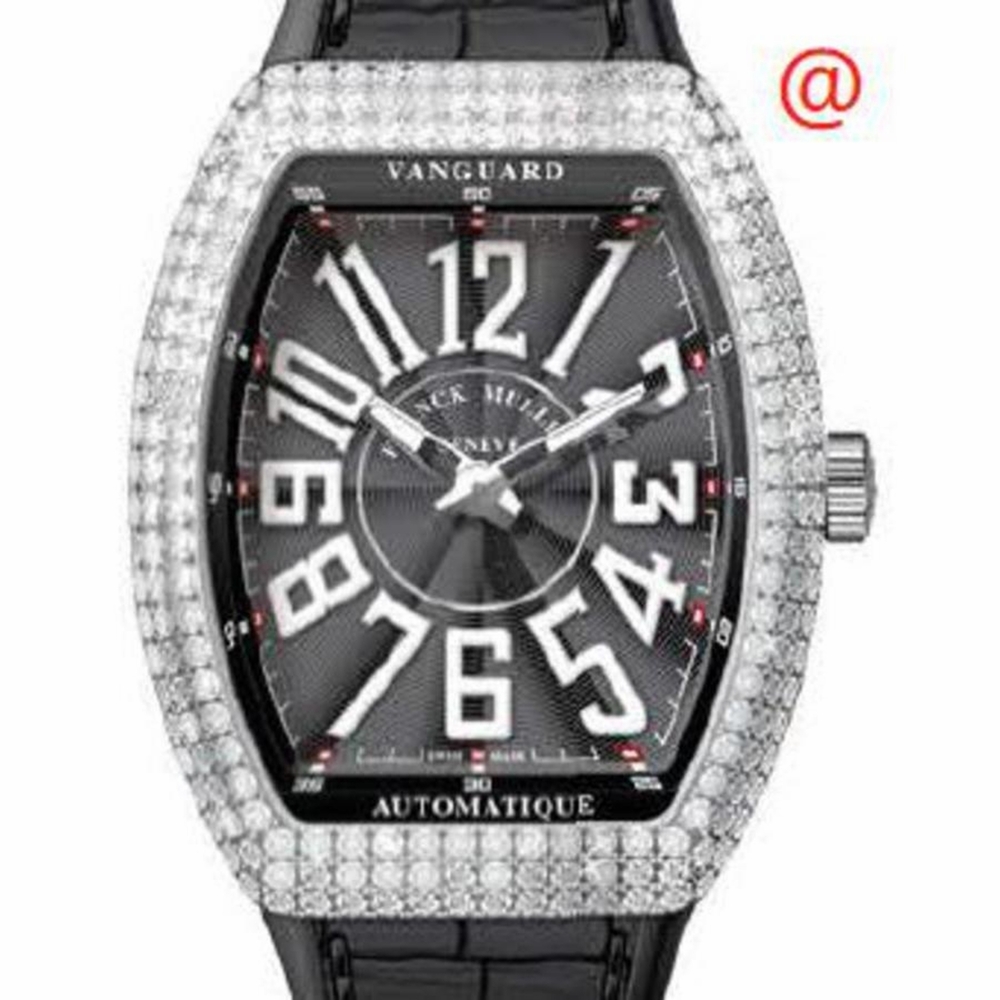 Silver-tone stainless steel case with a black alligator band. Fixed silver-tone bezel with diamond set stainless steel. Silver-tone dial with silver-tone hands and Arabic numeral hour markers. Minute markers around the outer rim. Dial Type: Analog. Luminescent hands and markers. Automatic movement. Scratch resistant sapphire crystal. Tonneau case shape, case size: 45 mm. Functions: hour, minute, second. Additional Info: original box, international warranty card, manual (complete accessories). Vanguard Series. Luxury watch style. Watch label: Swiss Made. Franck Muller Vanguard Automatic Diamond Silver Dial Mens Watch V45SATDACNR(NRBLCAC).
