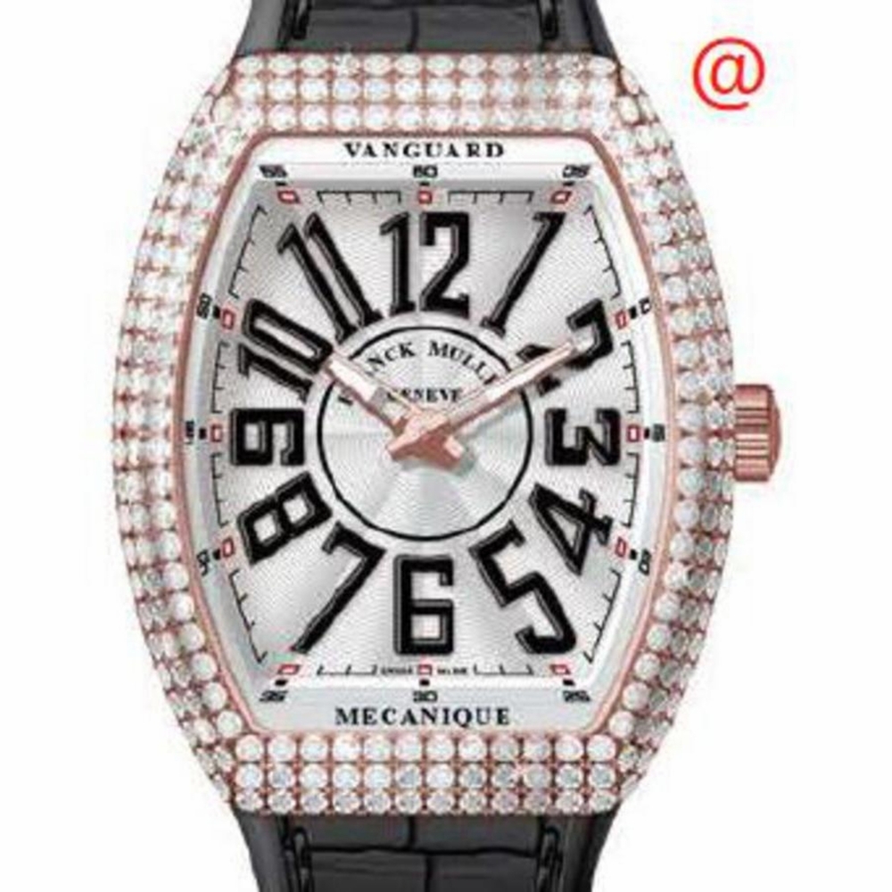 Rose gold-tone 18kt rose gold case with a black alligator band. Fixed rose gold-tone bezel with diamond set 18kt rose gold. Silver-tone dial with rose gold-tone hands and Arabic numeral hour markers. Minute markers around the outer rim. Dial Type: Analog. Luminescent hands and markers. Automatic movement. Scratch resistant sapphire crystal. Case size: 45 mm. Functions: hour, minute. Additional Info: original box, international warranty card, manual (complete accessories). Vanguard Series. Luxury watch style. Watch label: Swiss Made. Franck Muller Vanguard Automatic Diamond Silver Dial Mens Watch V45SD5NNR(BLCNR5N).