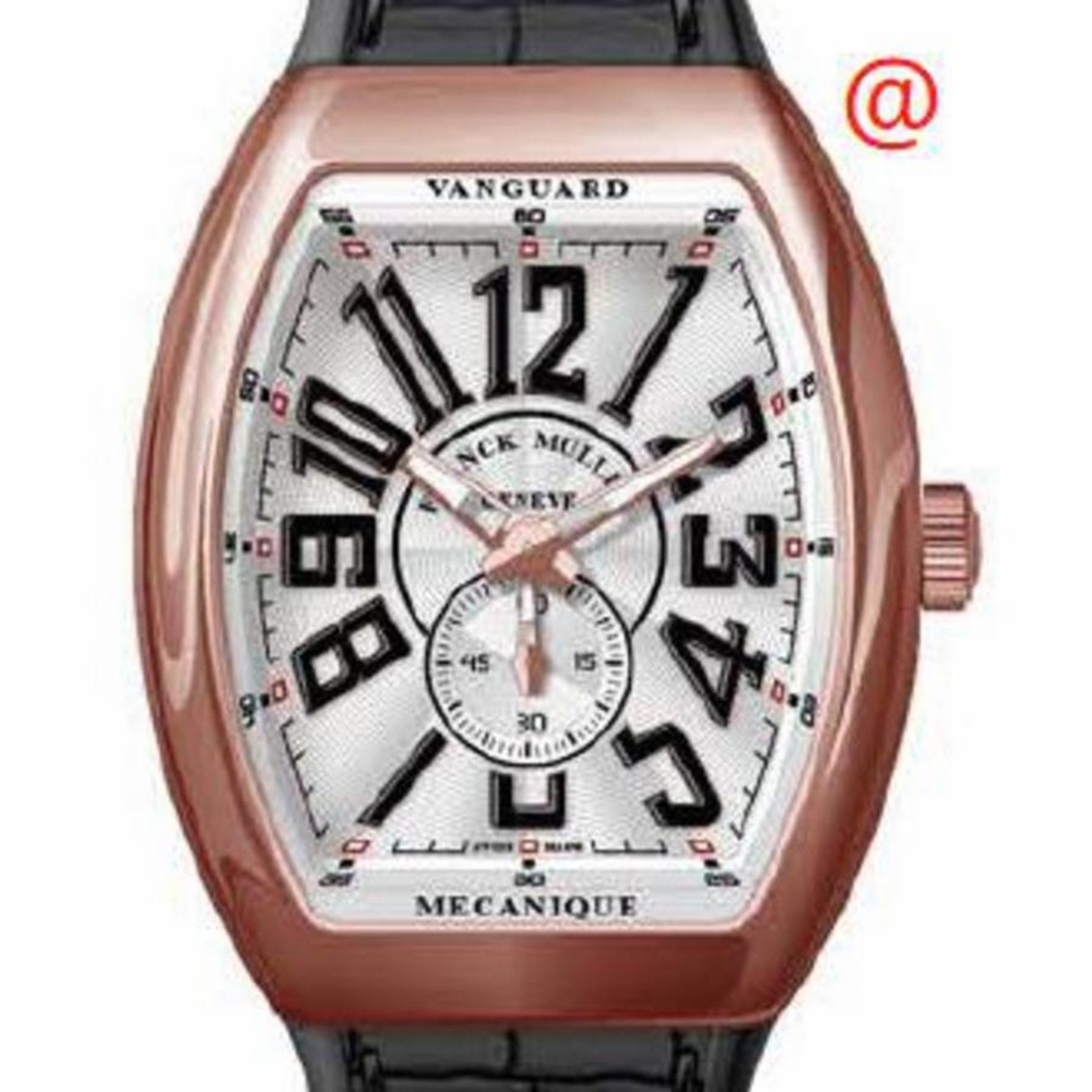 Rose gold-tone 18kt rose gold case with a black alligator band. Fixed rose gold-tone 18kt rose gold bezel. Silver-tone dial with rose gold-tone hands and Arabic numeral hour markers. Minute markers around the outer rim. Dial Type: Analog. Luminescent hands and markers. Automatic movement. Scratch resistant sapphire crystal. Tonneau case shape, case size: 45 mm. Functions: hour, minute, second. Additional Info: original box, international warranty card, manual (complete accessories). Vanguard Series. Luxury watch style. Watch label: Swiss Made. Franck Muller Vanguard Automatic Silver Dial Mens Watch V45SS65NNR(BLCNR5N).