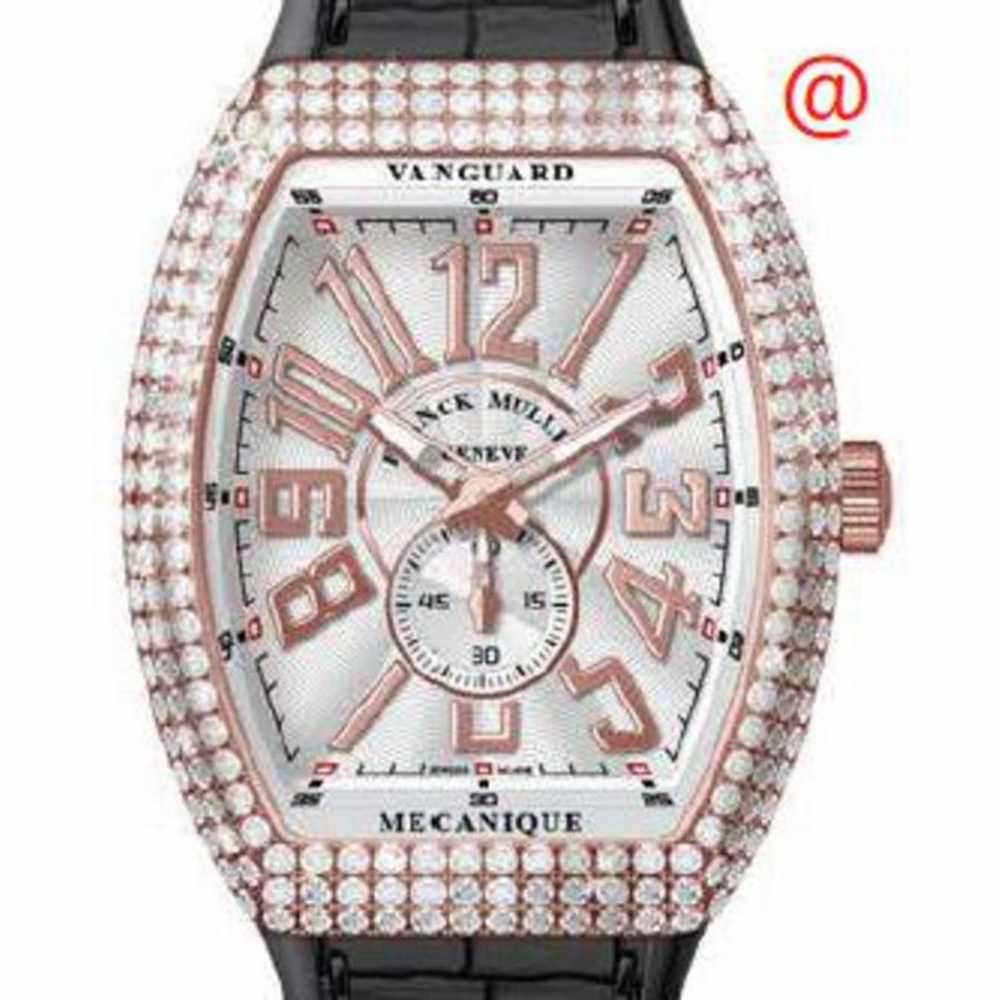 Rose gold-tone 18kt rose gold case with a black alligator band. Fixed rose gold-tone bezel with diamond set 18kt rose gold. Silver-tone dial with rose gold-tone hands and Arabic numeral hour markers. Minute markers around the outer rim. Dial Type: Analog. Luminescent hands and markers. Automatic movement. Scratch resistant sapphire crystal. Tonneau case shape, case size: 45 mm. Functions: hour, minute, second. Additional Info: original box, international warranty card, manual (complete accessories). Vanguard Series. Luxury watch style. Watch label: Swiss Made. Franck Muller Vanguard Automatic Diamond Silver Dial Mens Watch V45SS6RELD5NNR(BLC5N).