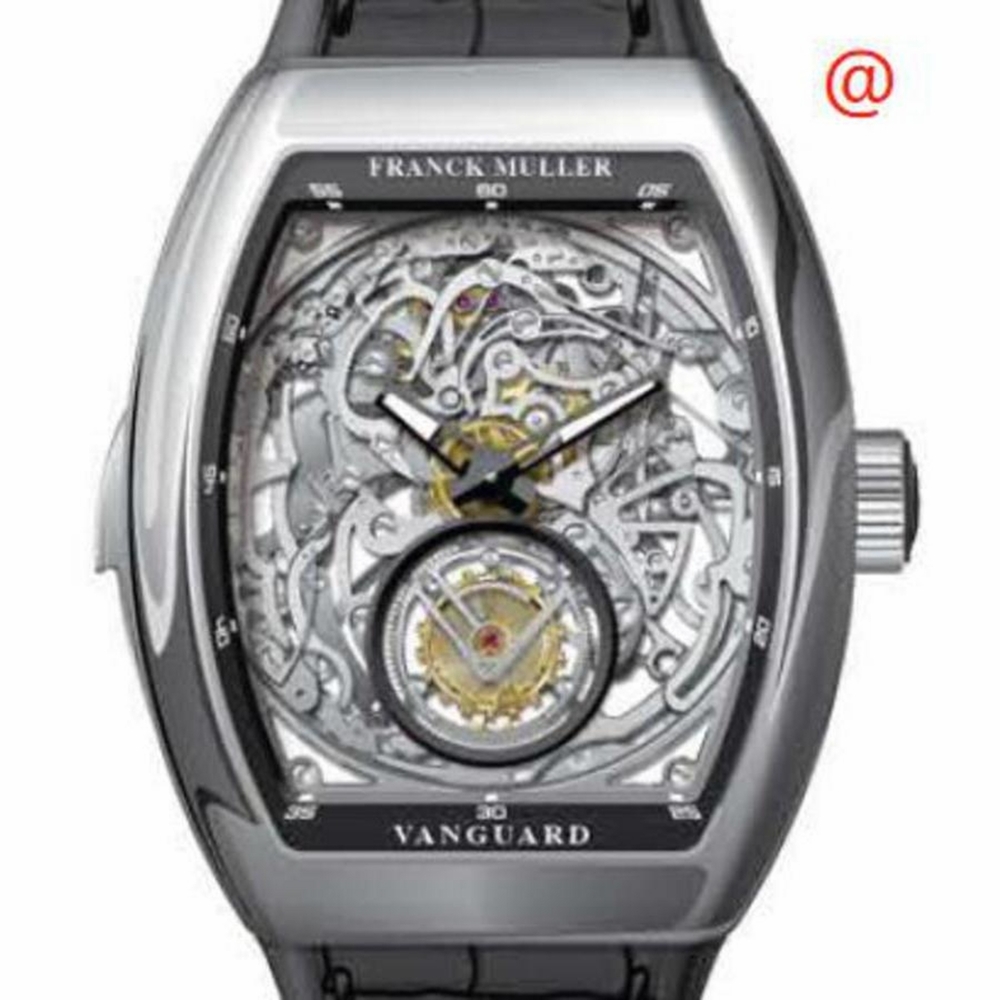 Silver-tone stainless steel case with a black leather strap. Fixed silver-tone stainless steel bezel. Silver-tone dial with black hands and Arabic numeral hour markers. Dial Type: Analog. Luminescent hands and markers. Hand wind movement. Scratch resistant sapphire crystal. Screw down crown. Transparent see through case back. Tonneau case shape, case size: 46 mm. Functions: hour, minute, second. Additional Info: original box, international warranty card, manual (complete accessories). Vanguard Series. Luxury watch style. Watch label: Swiss Made. Franck Muller Vanguard Hand Wind Silver Dial Mens Watch V50LRMTSQT(ACNR).