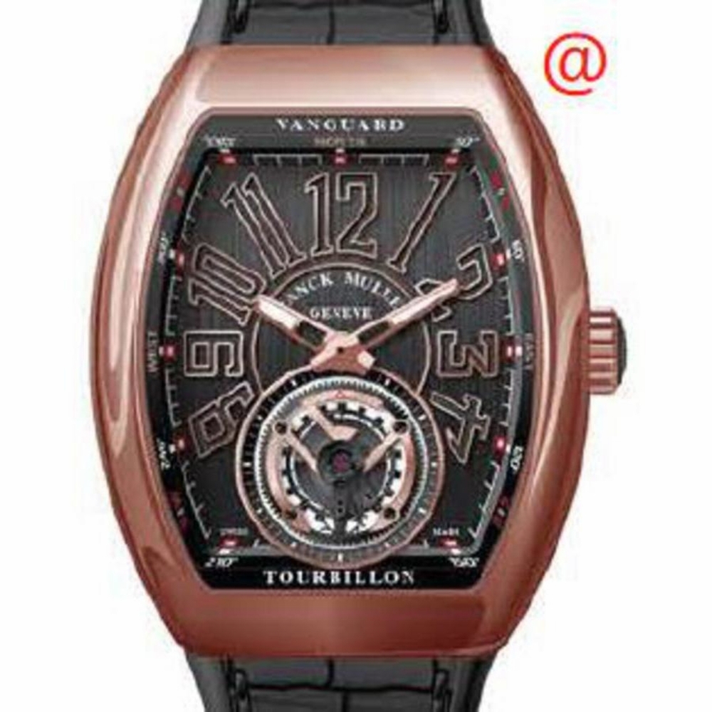 Rose gold-tone 18kt rose gold case with a black alligator band. Fixed rose gold-tone 18kt rose gold bezel. Black dial with rose gold-tone hands and Arabic numeral hour markers. Minute markers around the outer rim. Dial Type: Analog. Luminescent hands and markers. Hand wind movement. Scratch resistant sapphire crystal. Transparent see through case back. Tonneau case shape, case size: 41 mm. Functions: hour, minute, second. Additional Info: original box, international warranty card, manual (complete accessories). Vanguard Tourbillon Series. Luxury watch style. Watch label: Swiss Made. Franck Muller Vanguard Tourbillon Hand Wind Black Dial Mens Watch V41T5NNR(NRNR5N).