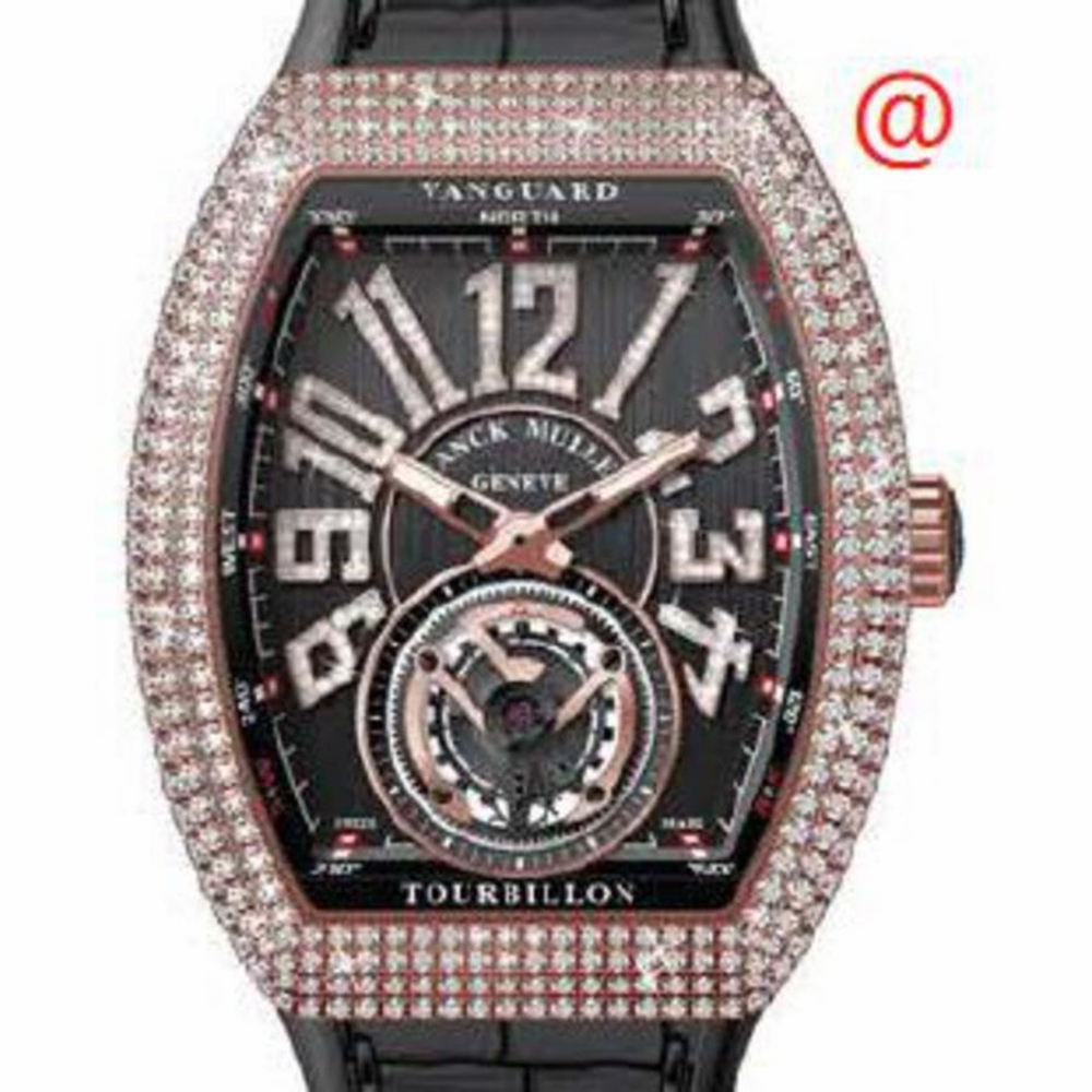Rose gold-tone 18kt rose gold case with a black alligator band. Fixed rose gold-tone bezel with diamond set 18kt rose gold. Black dial with rose gold-tone hands and Arabic numeral hour markers. Minute markers around the outer rim. Dial Type: Analog. Luminescent hands and markers. Hand wind movement. Scratch resistant sapphire crystal. Transparent see through case back. Tonneau case shape, case size: 41 mm. Functions: hour, minute, second. Additional Info: original box, international warranty card, manual (complete accessories). Vanguard Tourbillon Series. Luxury watch style. Watch label: Swiss Made. Franck Muller Vanguard Tourbillon Hand Wind Diamond Black Dial Mens Watch V41TDNBRCD5NNR(NRDIAM5N).