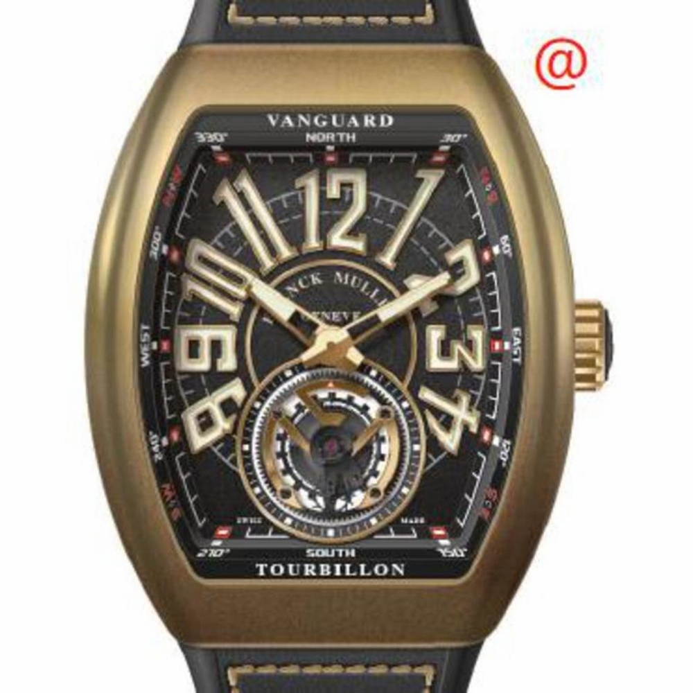 Bronze case with a black alligator band. Fixed bronze bezel. Black dial with gold-tone hands and Arabic numeral hour markers. Minute markers around the outer rim. Dial Type: Analog. Luminescent hands and markers. Hand wind movement. Scratch resistant sapphire crystal. Transparent see through case back. Tonneau case shape, case size: 45 mm. Functions: hour, minute, second. Additional Info: original box, international warranty card, manual (complete accessories). Vanguard Tourbillon Series. Luxury watch style. Watch label: Swiss Made. Franck Muller Vanguard Tourbillon Hand Wind Black Dial Mens Watch V45TCIRBZBRNR(NRBLCBZBR).