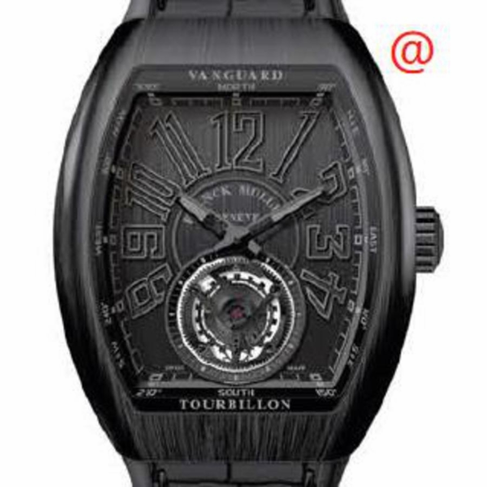 Black titanium case with a black alligator band. Fixed black titanium bezel. Black dial with black hands and Arabic numeral hour markers. Minute markers around the outer rim. Dial Type: Analog. Luminescent hands and markers. Hand wind movement. Scratch resistant sapphire crystal. Transparent see through case back. Tonneau case shape, case size: 44 mm. Functions: hour, minute, second. Additional Info: original box, international warranty card, manual (complete accessories). Vanguard Tourbillon Series. Luxury watch style. Watch label: Swiss Made. Franck Muller Vanguard Tourbillon Hand Wind Black Dial Mens Watch V45TTTNRBRNR(NRNRNR).