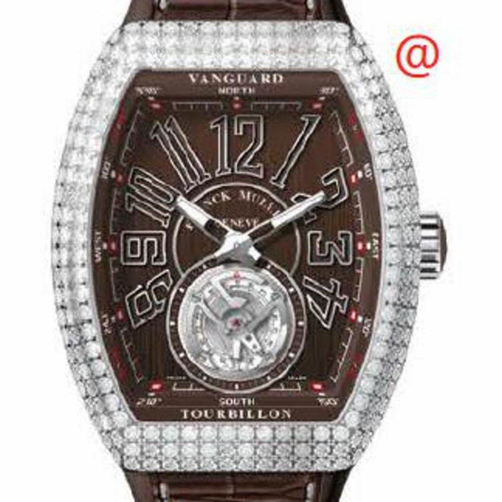 Silver-tone stainless steel case with a brown alligator band. Fixed silver-tone bezel with diamond set stainless steel. Brown dial with silver-tone hands and Arabic numeral hour markers. Dial Type: Analog. Luminescent hands and markers. Hand wind movement. Scratch resistant sapphire crystal. Transparent see through case back. Tonneau case shape, case size: 45 mm. Functions: hour, minute, second. Additional Info: original box, international warranty card, manual (complete accessories). Vanguard Tourbillon Series. Luxury watch style. Watch label: Swiss Made. Franck Muller Vanguard Tourbillon Hand Wind Diamond Brown Dial Mens Watch V45TDACBN(BNBNAC).