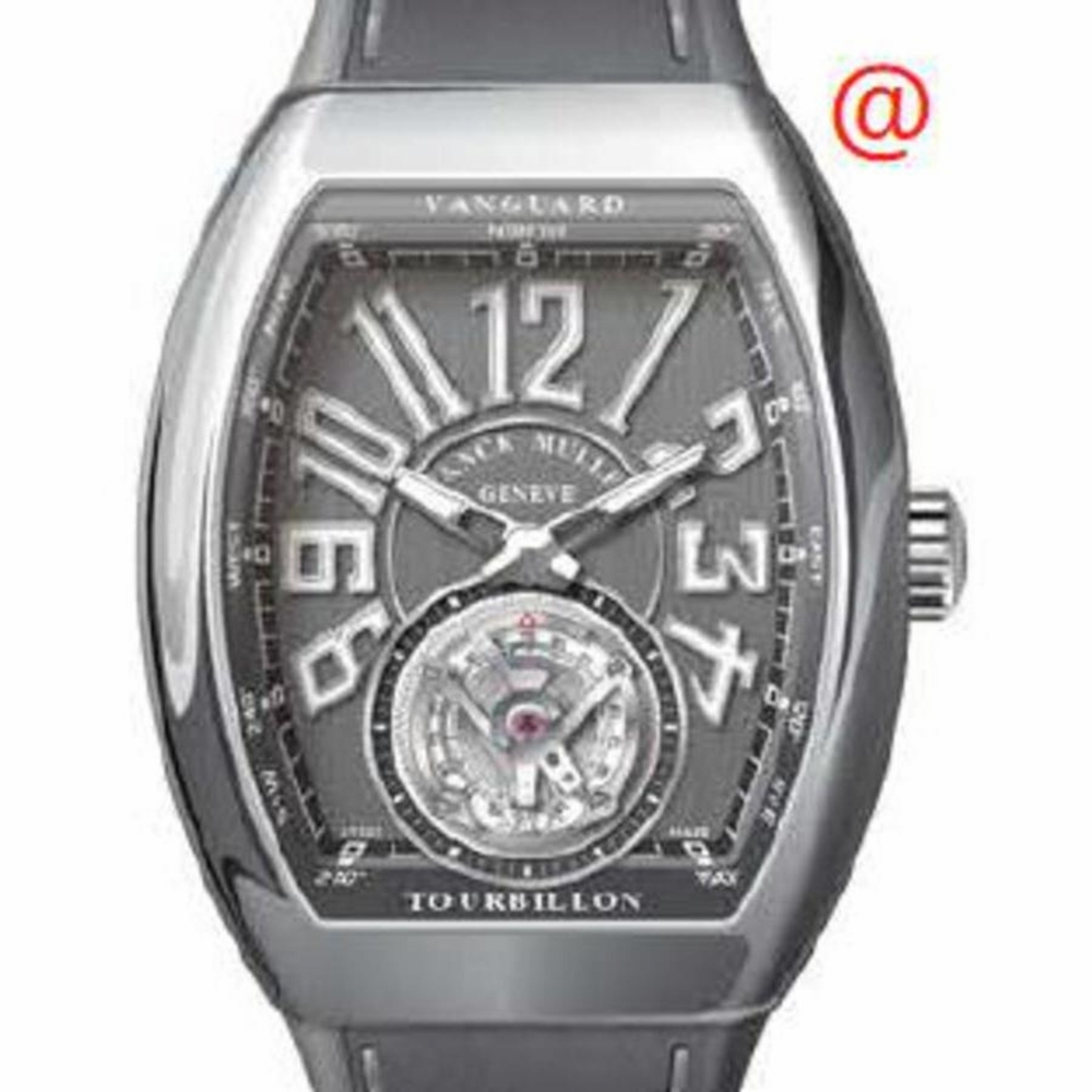Silver-tone stainless steel case with a grey rubber strap. Fixed silver-tone stainless steel bezel. Grey dial with silver-tone hands and Arabic numeral hour markers. Minute markers around the outer rim. Dial Type: Analog. Luminescent hands and markers. Hand wind movement. Scratch resistant sapphire crystal. Transparent see through case back. Tonneau case shape, case size: 41 mm. Functions: hour, minute, second. Additional Info: original box, international warranty card, manual (complete accessories). Vanguard Tourbillon Series. Luxury watch style. Watch label: Swiss Made. Franck Muller Vanguard Tourbillon Hand Wind Grey Dial Mens Watch V41TACTT(TTBLCAC).